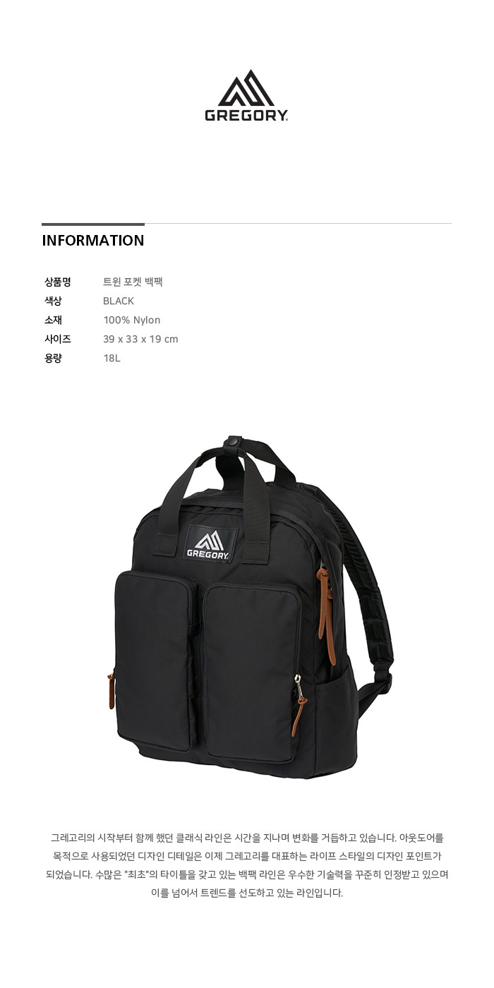 그레고리 트윈 포켓 백팩 블랙 (09J29379) 18L
