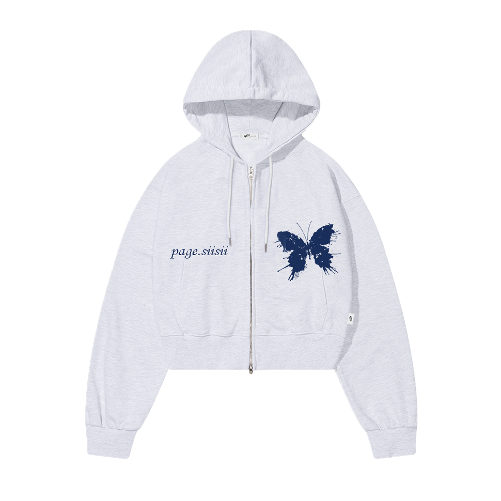 페이지시시 섀도우 버터플라이 프린트 크롭 후드집업 화이트멜란지