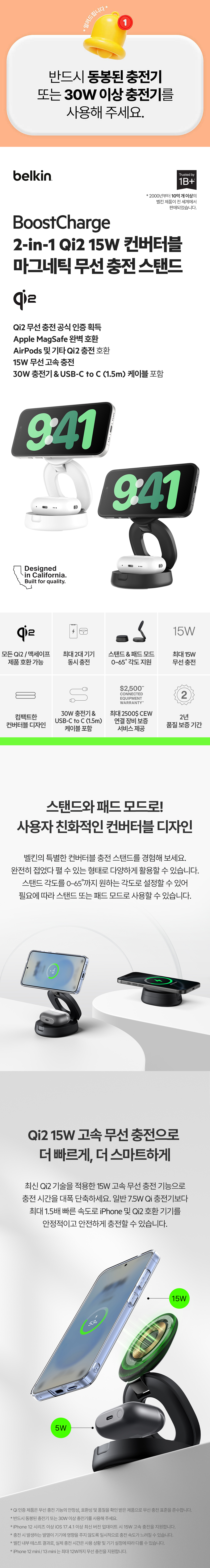 벨킨 Qi2 15W 2in1 컨버터블 마그네틱 무선 충전 스탠드 WIZ035kr 화이트
