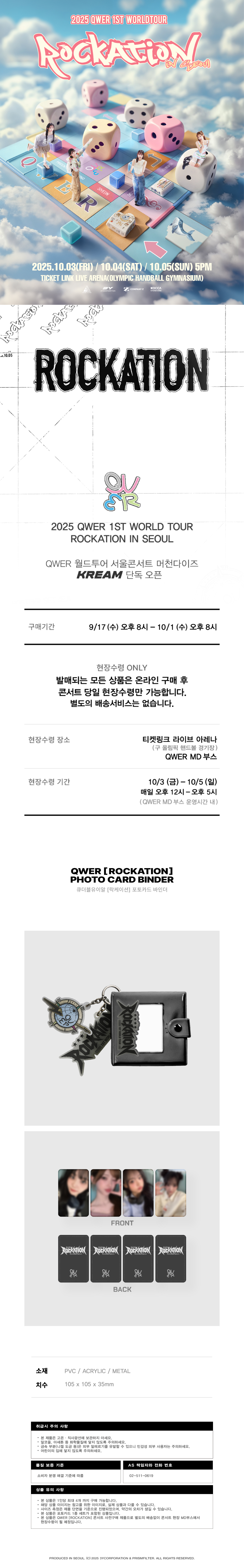 본 상품은 QWER [ROCKATION] 콘서트 사전구매 제품으로 별도의 배송없이 콘서트 현장 MD부스에서 현장수령이 될 예정입니다.