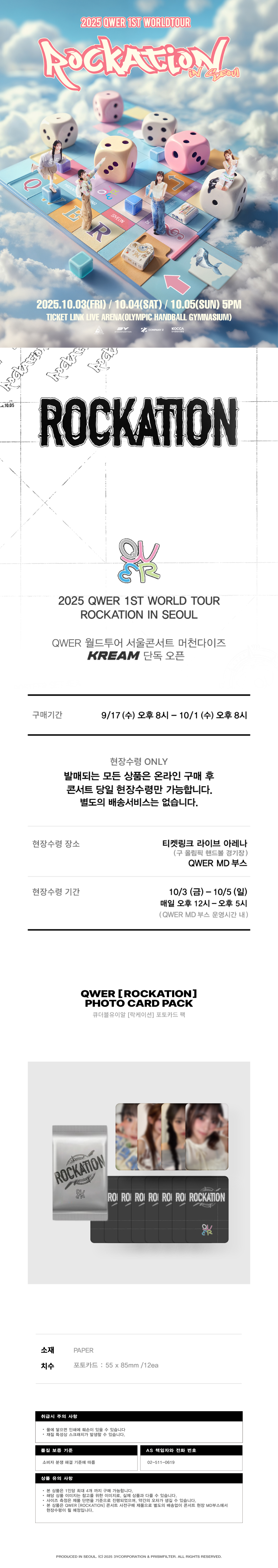 본 상품은 QWER [ROCKATION] 콘서트 사전구매 제품으로 별도의 배송없이 콘서트 현장 MD부스에서 현장수령이 될 예정입니다.