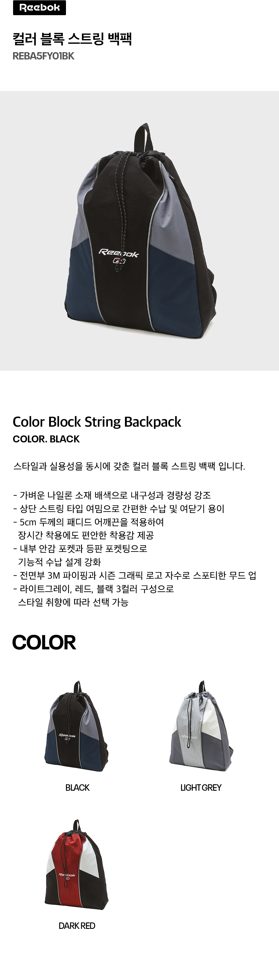 리복 컬러 블록 스트링 백팩 블랙