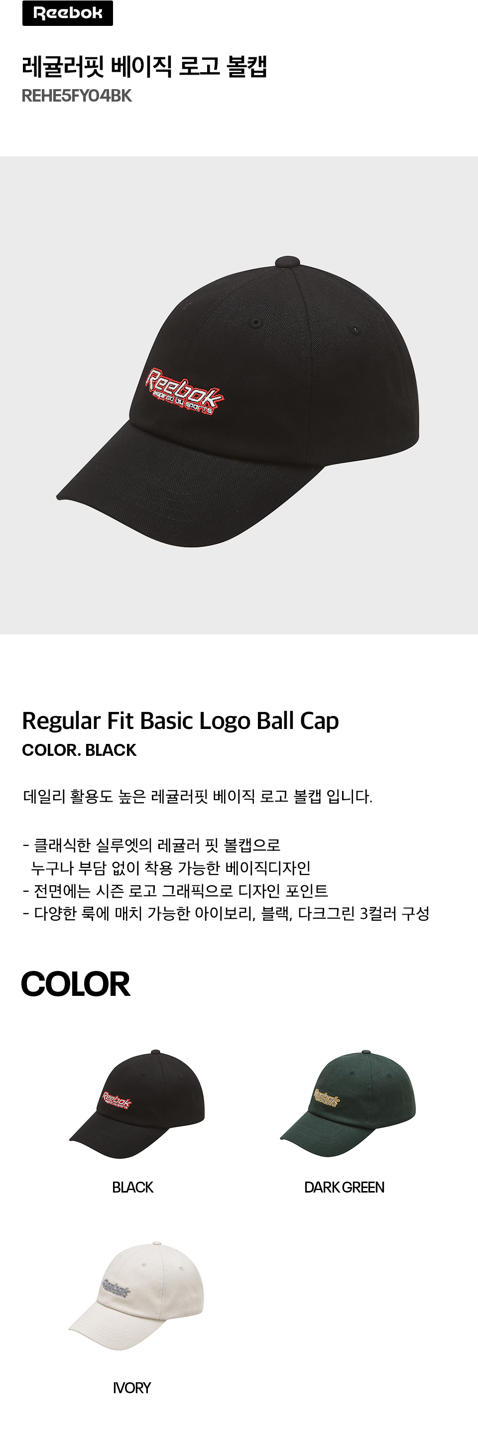 리복 레귤러핏 베이직 로고 볼캡 블랙