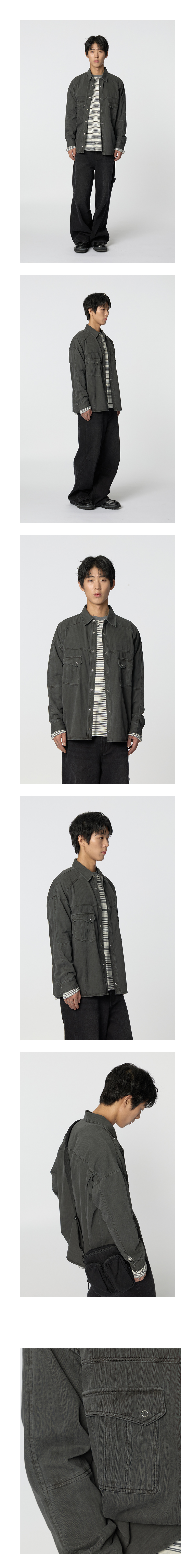 - 어깨가 드롭된 오버핏 셔츠 - COTTON 100% 원단사용 - 가먼트 피그먼트 다잉 - 프론트 투포켓 디자인 - 니켈 스냅 버튼 포인트 - 커프스 스냅 버튼 MADE IN CHINA