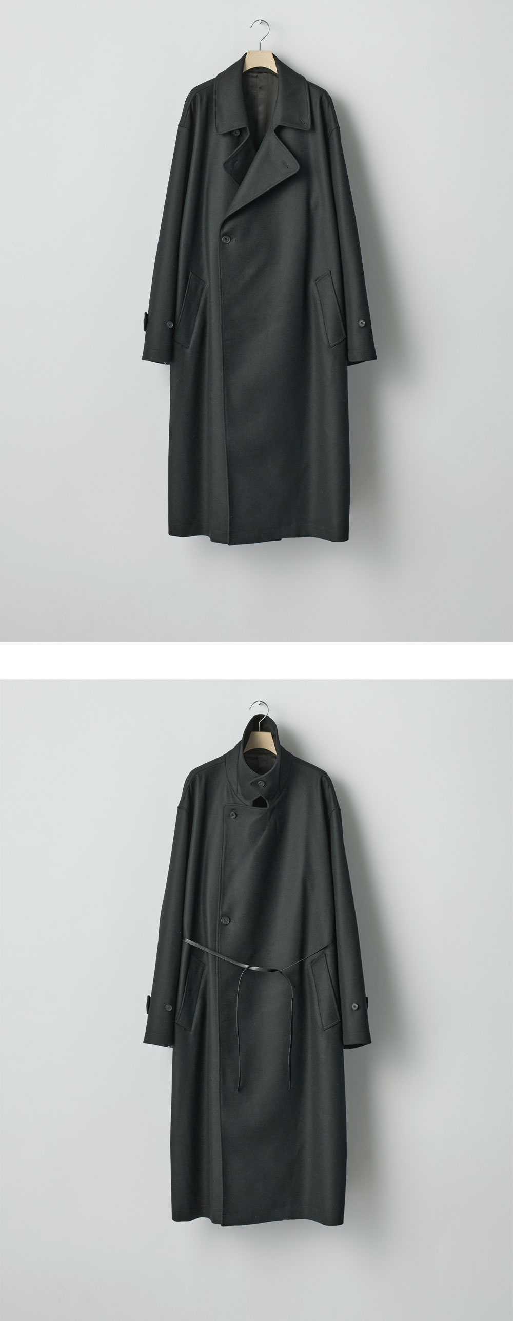 클래식한 실루엣에 허리라인 조절 가능한 슈타인 오버사이즈 더블 브레스티드 코트 블랙입니다. - 고급 Super 120’s 울 멜턴 소재의 더블 브레스티드 코트 - 은은한 광택과 부드러운 촉감이 특징 - 내장형 레더 스트링으로 허리 실루엣 조절이 가능