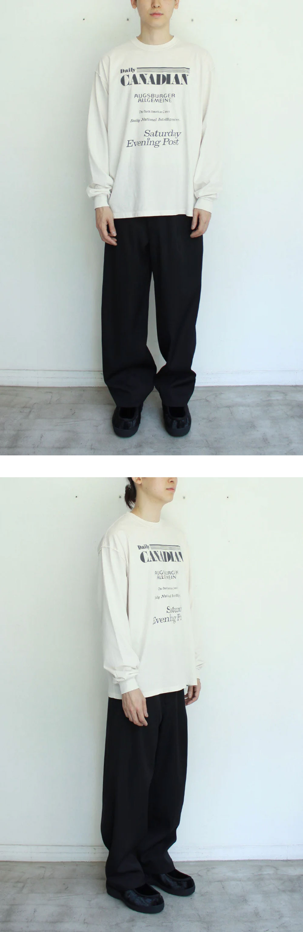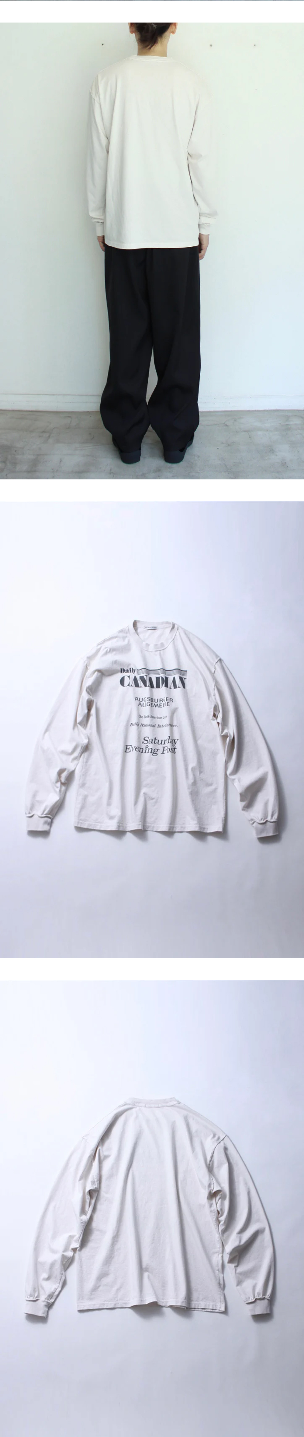 인사이드아웃 디테일이 돋보이는 소이 리버스 롱슬리브 티 에크루입니다. - 소매와 넥라인의 리브 처리, 테이핑(타코 바인더)을 겉으로 드러낸 독특한 마감 - 세계 각국 신문사 로고를 콜라주한 그래픽 프린트 - 서로 다른 폰트와 레이아웃을 조합해 일상 속 타이포그래피의 깊이를 표현 - 워싱 및 염색 가공으로, 제품마다 미묘한 차이가 있을 수 있음 (개체차 주의) *모델 스펙 : 178cm / 60kg (002 사이즈 착용)