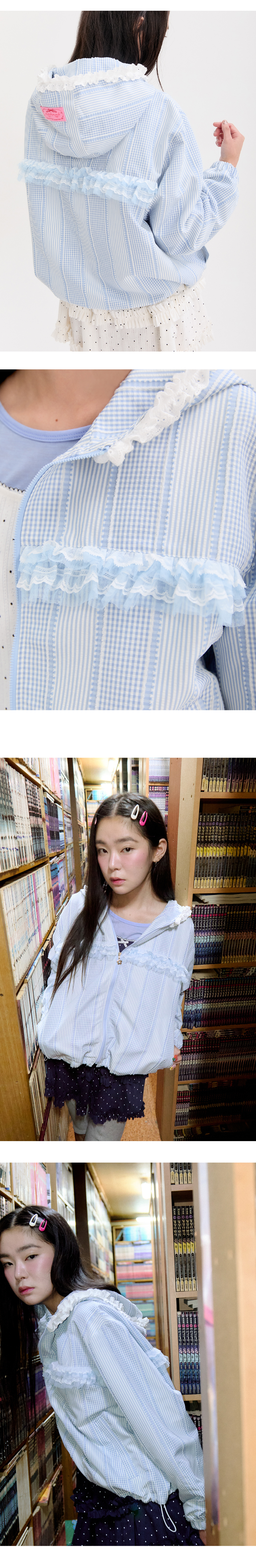 스트라이프,체크의 멀티패턴 원단에 프릴과 레이스로 사랑스러움을 더해준 점퍼입니다. 플라워 형태의 지퍼 슬라이더와 후드에 부착한 라벨로 포인트를 더했습니다. 너무 얇지 않은 소재로 간절기 착용하기 좋은 아이템입니다. 착용시 귀여운 핏감을 위해 후드 사이즈를 넉넉하게 제작했습니다. 실루엣은 하단 스토퍼로 조절 가능합니다.