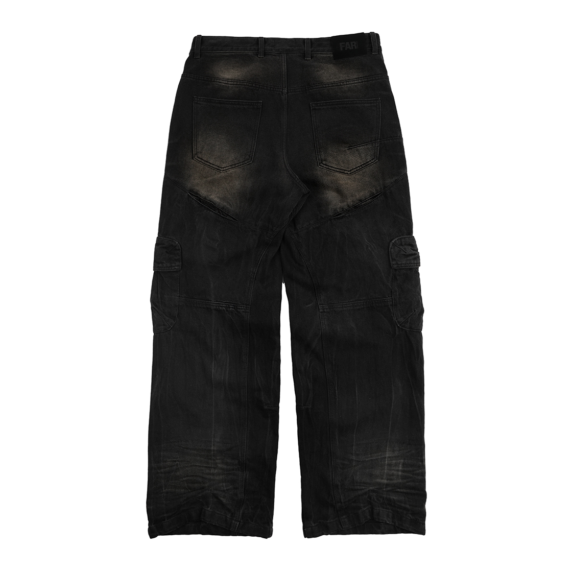 묵직한 블랙 워싱이 매력적인 와이드 카고 데님입니다. 전면으로 흐르는 페이드와 입체 절개가 다리 라인을 강조하고, 무릎 3D 패널과 측면 카고 포켓이 유틸리티 무드를 완성합니다. 여유로운 힙·허벅지와 롱 인심이 만들어내는 풍부한 스택 실루엣이 가장 큰 포인트. 두꺼운 데님, 리벳·더블 스티치로 내구성을 높였으며, 미드라이즈 착용감과 깊은 포켓 구성으로 일상에서 편하고 실용적입니다.