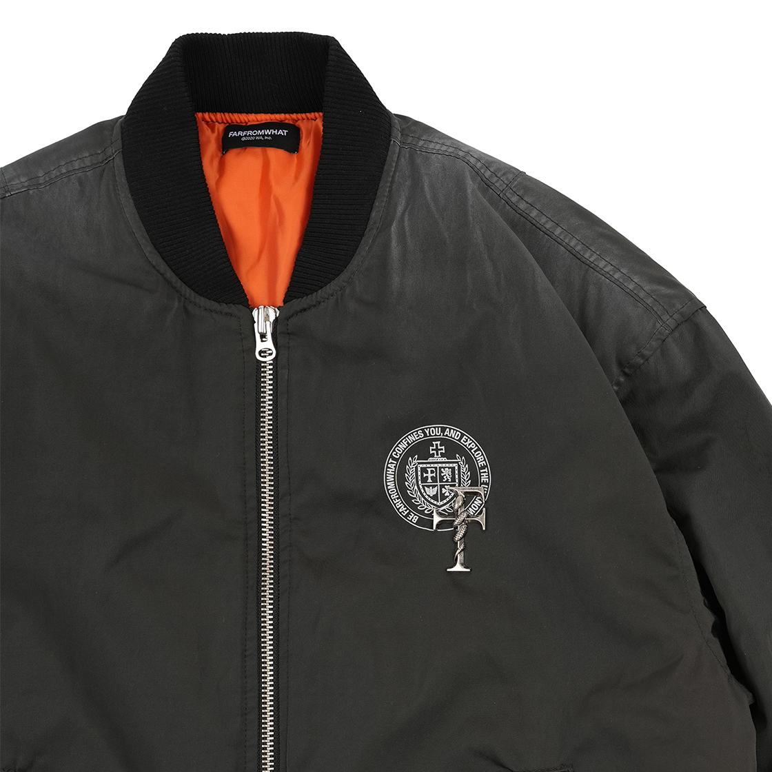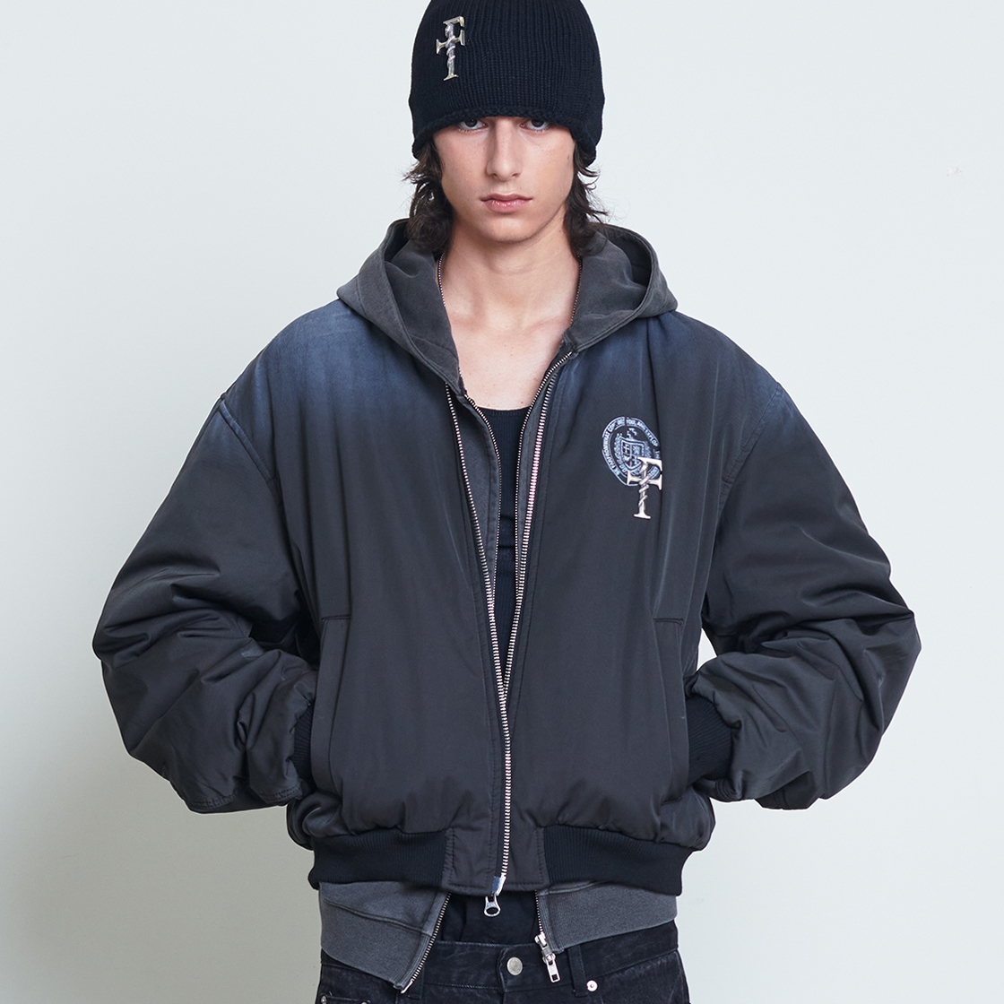 차분한 차콜 그레이의 매트 나일론 봄버 재킷입니다. 은은한 워싱 가공으로 새 옷임에도 자연스러운 텍스처와 깊이감이 살아나며, 가슴 전면의 메탈 펜던트가 즉시 시선을 끄는 포인트로 다른 보머들과 확실히 차별화됩니다. 충전감과 숏 기장, 탄탄한 밑단·소매 립이 볼륨 있는 실루엣을 잡아주고, 드롭 숄더 루즈 핏으로 편안합니다. 투웨이 지퍼 + 체인 풀러, 후디·니트 위에 가볍게 레이어드하면 완성되는 스트리트 무드. 데님·카고·슬랙스까지 두루 잘 어울리는 데일리 아우터입니다