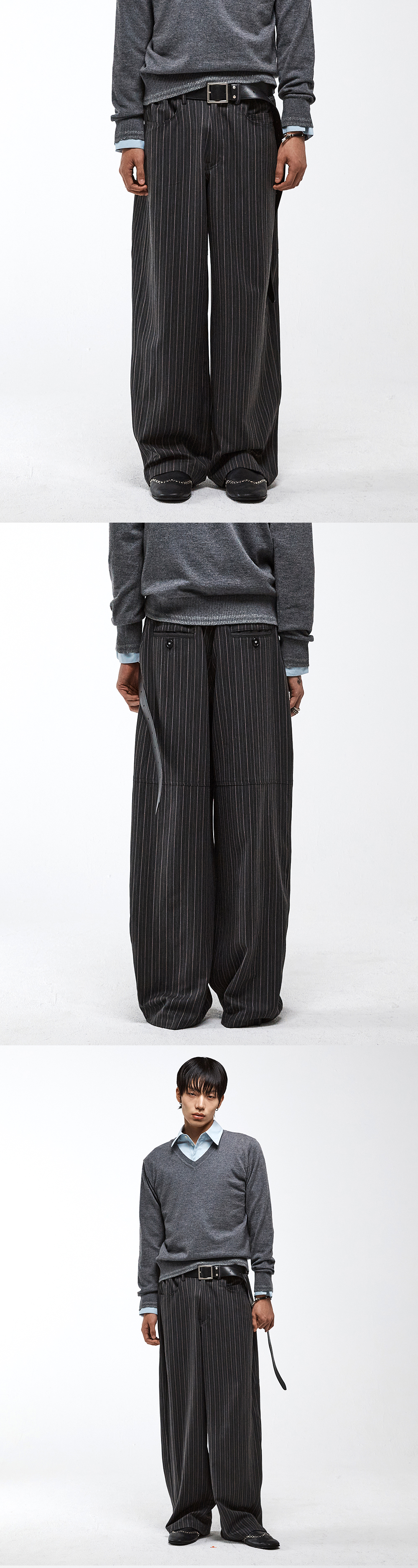 핀스트라이프 원단에 다중 패널 절개를 더해 구조적인 실루엣을 강조한 팬츠입니다. 여유 있는 릴렉스 핏으로 떨어지며, 직선적인 패턴과 절개 라인이 어우러져 독특한 균형감을 만듭니다. 허리 부분은 밴딩 처리되어 편안한 착용감을 제공하며, 포멀한 무드 속에서도 실용적인 요소를 더했습니다. -DETAIL- 핀스트라이프 원단 다중 패널 절개 디테일 릴렉스 핏 허리 밴딩 처리 6구 H 봉제 천연 소뿔 단추