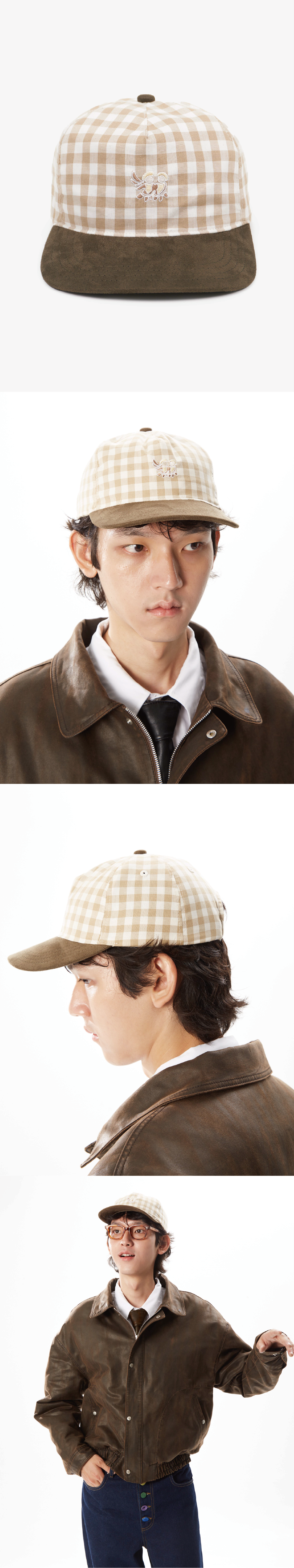 체크 원단과 스웨이드를 혼용한 5패널 캡입니다. 전면에는 천사 모양 자수를 통해 체크 패턴과 자수의 조화로 클래식한 감성이 드러납니다.