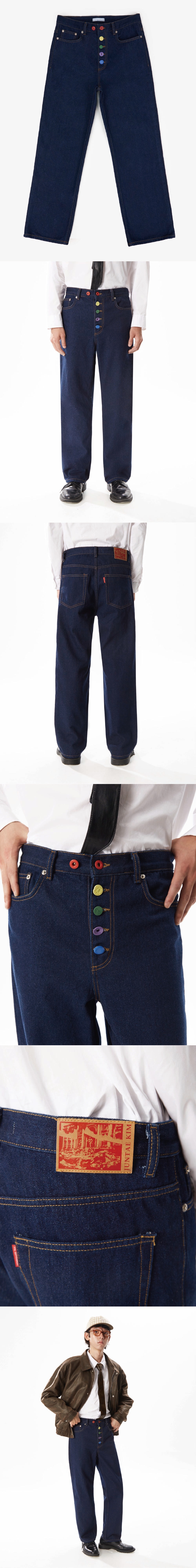버튼 플라이 바깥으로 형형색색의 캔톤 스냅이 드러나는 디테일이 특징인 데님 팬츠입니다. 워싱을 통해 부드럽고 자연스러운 텍스처를 완성했습니다.