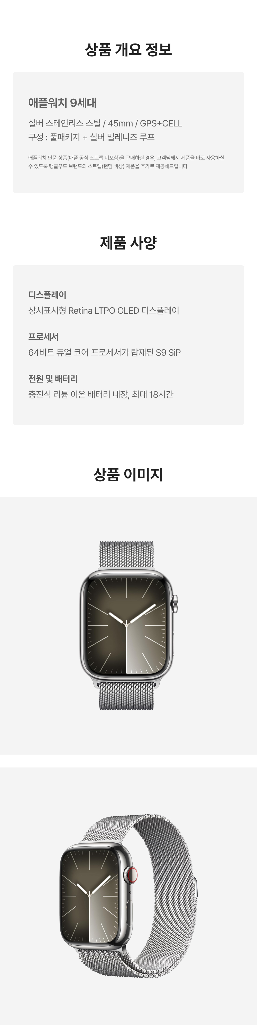 [S등급] 리퍼비시 애플워치 9 45mm 셀룰러 실버 스테인리스 스틸 케이스 밀레니즈 루프 실버