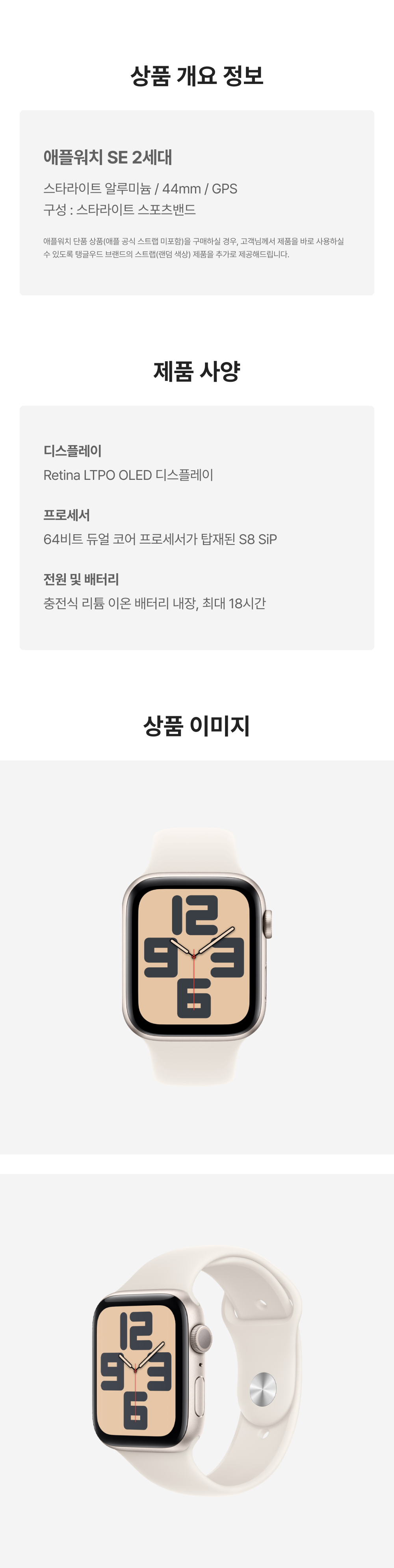 [S등급] 리퍼비시 애플워치 SE 2세대 44mm GPS 스타라이트 알루미늄 케이스 스포츠 밴드 스타라이트