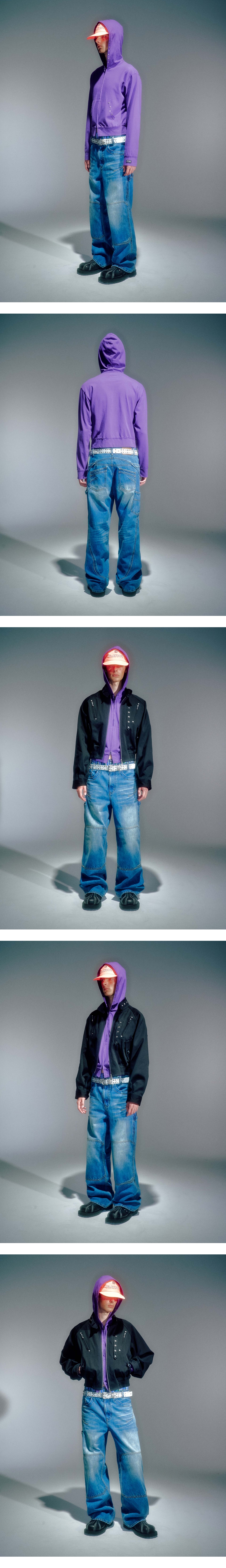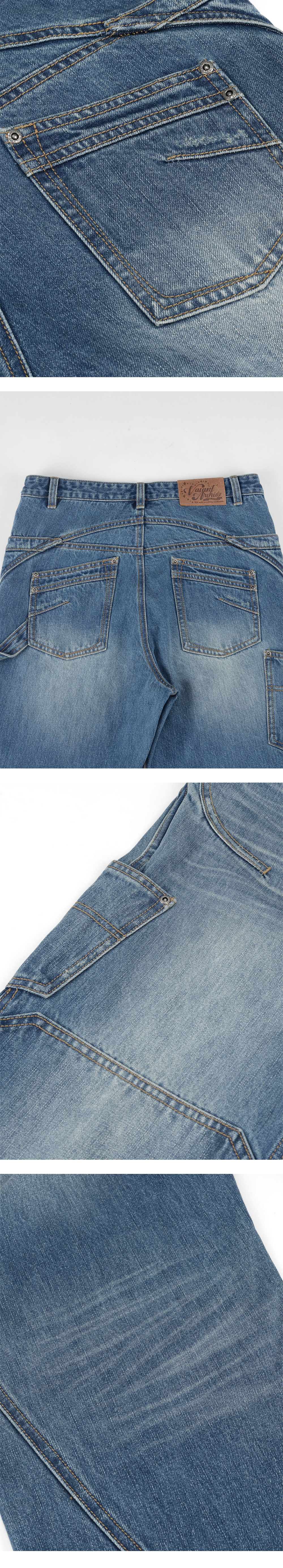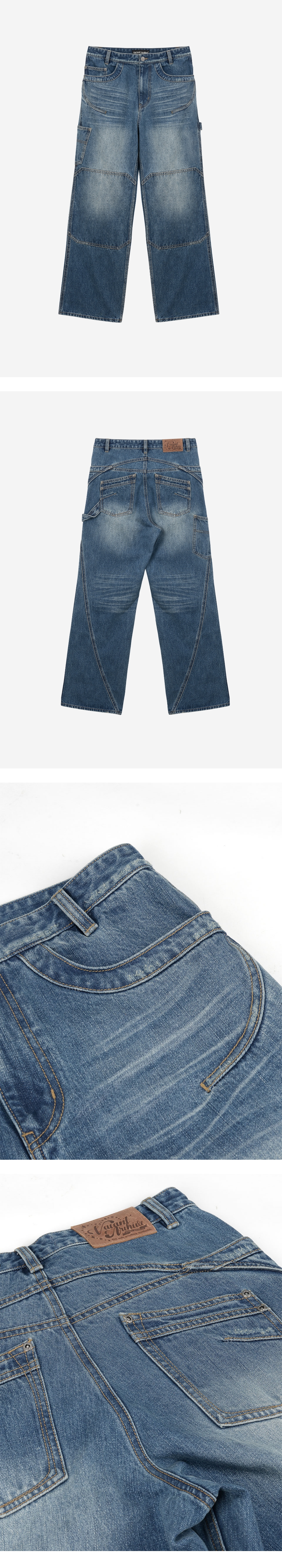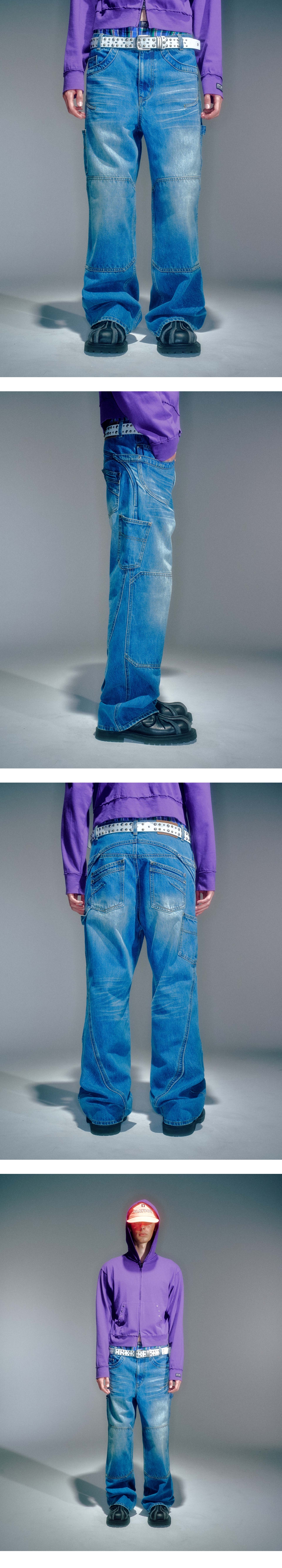 전면부에서 후면부로 이어지는 절개 디테일 후면부 사선 절개 디테일 전/후면부 워싱 디테일 불규칙한 데미지 가공으로 빈티지함 연출 무릎부분 워크웨어적인 덧장 사용해 내구성 보강 세미 와이드 실루엣 베이컨트 제작 장식 사용 M/L (CM) Length : 110 / 112 Waist : 42.5 / 44.5 Hip : 53 / 55 Thigh : 33 / 34 Front Rise : 32/ 33 Hem : 27 / 28 COTTON 80% POLYESTER 20%