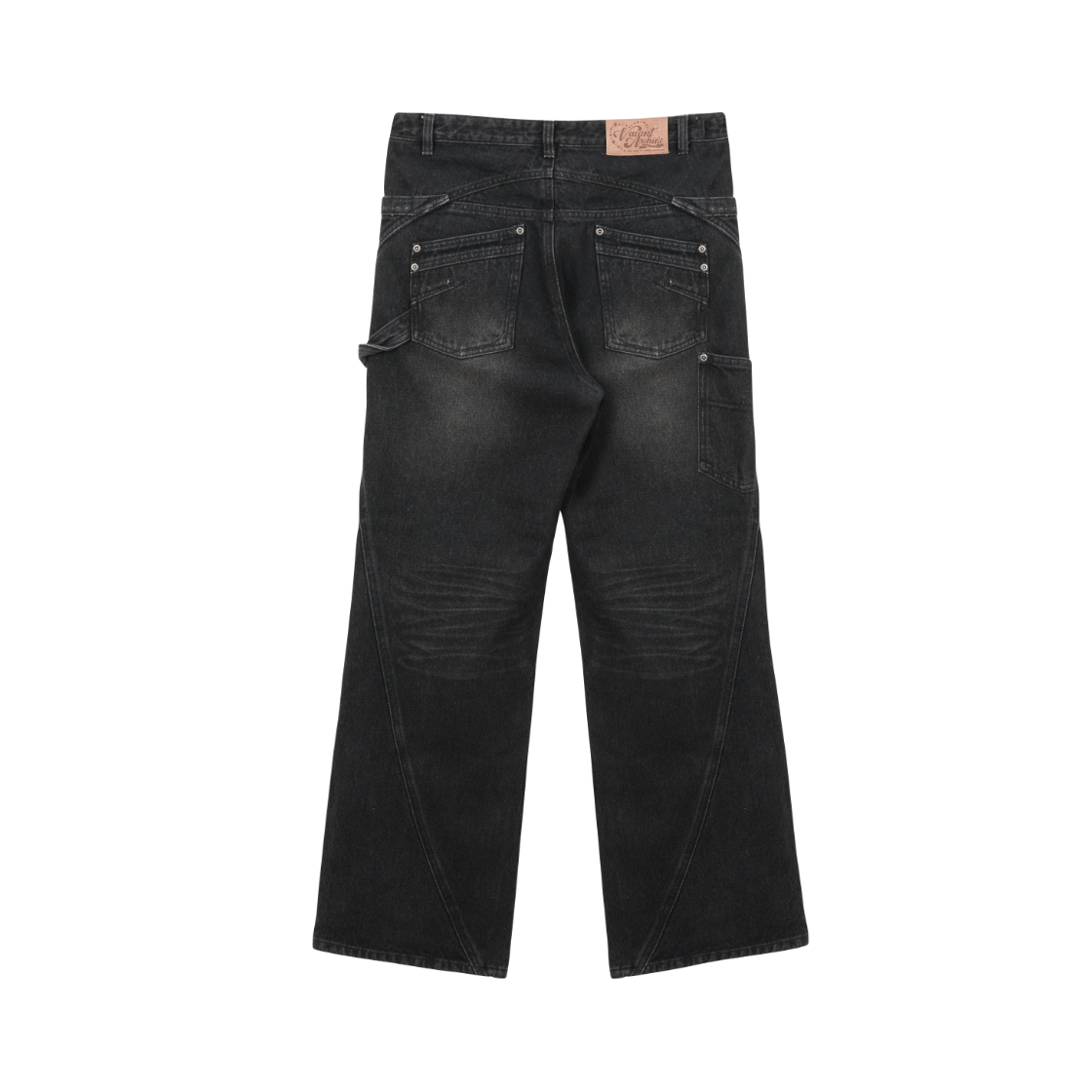 전면부에서 후면부로 이어지는 절개 디테일 후면부 사선 절개 디테일 전/후면부 워싱 디테일 불규칙한 데미지 가공으로 빈티지함 연출 무릎부분 워크웨어적인 덧장 사용해 내구성 보강 세미 와이드 실루엣 베이컨트 제작 장식 사용 M/L (CM) Length : 110 / 112 Waist : 42.5 / 44.5 Hip : 53 / 55 Thigh : 33 / 34 Front Rise : 32/ 33 Hem : 27 / 28 COTTON 100%