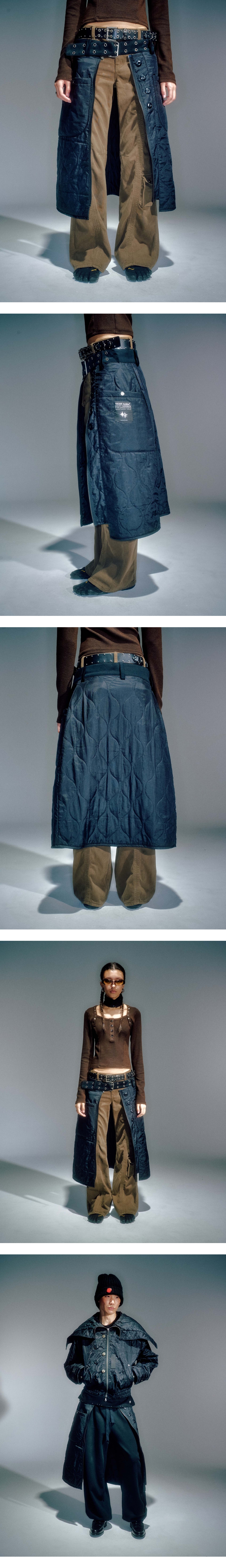 2온스 코튼 솜으로 누빔 처리하여 보온력 높은 레이어드 스커트 벹트 벨트 버클로 허리 사이즈 조절 베이컨트 워크웨어 라벨 디테일 YKK 지퍼 사용 ONESIZE (CM) Length : 71 Waist : 39 Hip : 52 SHELL 1 : NYLON 100% SHELL 2 : COTTON 100% LINING : NYLON 100%