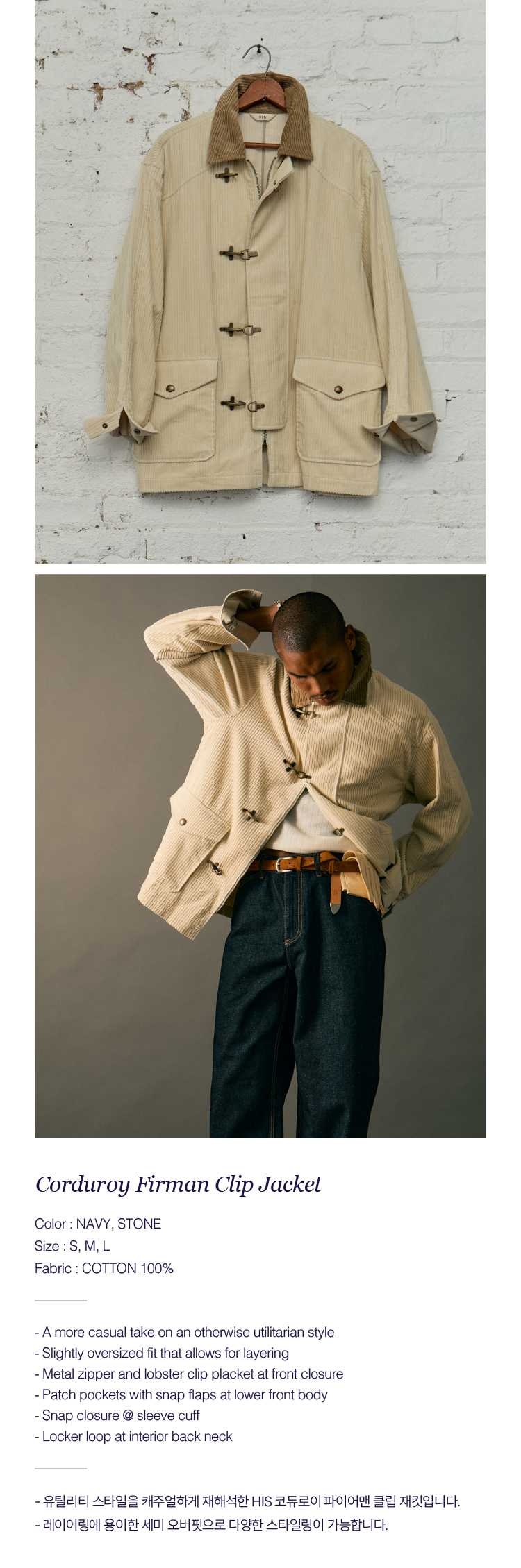 유틸리티 스타일을 캐주얼하게 재해석한 HIS 코듀로이 파이어맨 클립 재킷입니다. 레이어링에 용이한 세미 오버핏으로 다양한 스타일링이 가능합니다.