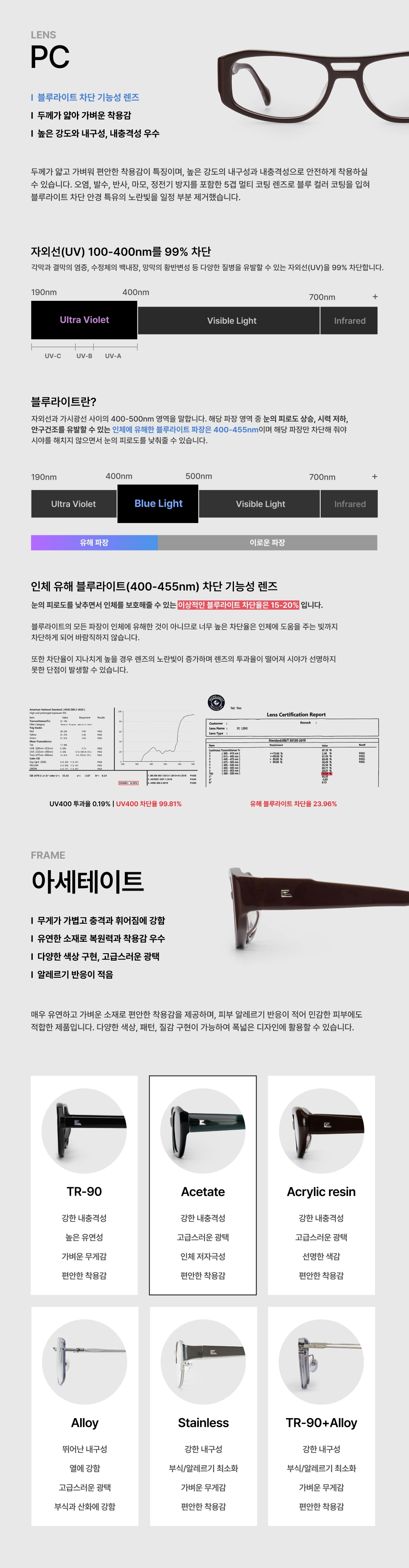 도수가 없는 아이웨어(안경테/선글라스 포함)를 취급하고 있습니다. 도수 렌즈가 필요하신 분들은 제품 수령 후 가까운 안경점 방문 부탁 드립니다. 남녀 공용으로 제작되었지만 개개인 얼굴형에 따라 피팅감은 개인차가 있어, 상품 수령 후 가까운 안경점 방문하시어 얼굴형에 맞게 피팅 후 착용 권장 드립니다.