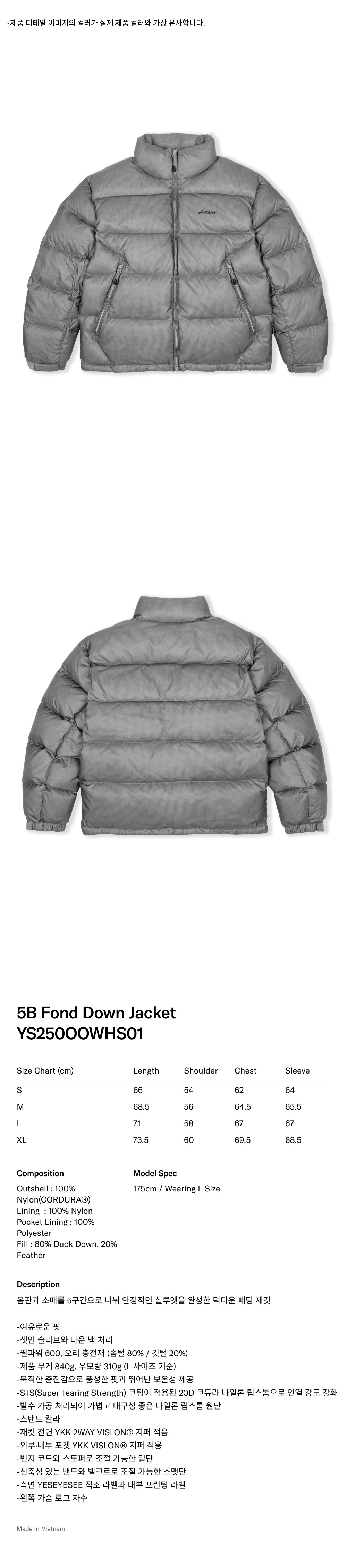 예스아이씨 파이브비 폰드 다운 재킷 라이트 그레이