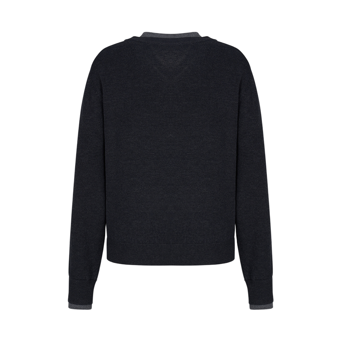 레이어드 디자인 니트입니다. 넥 라인과 소매 끝단에 겹쳐 입은 듯한 레이어드 효과를 주었습니다. 메리노 울 소재로 부드러운 텍스쳐가 특징입니다.