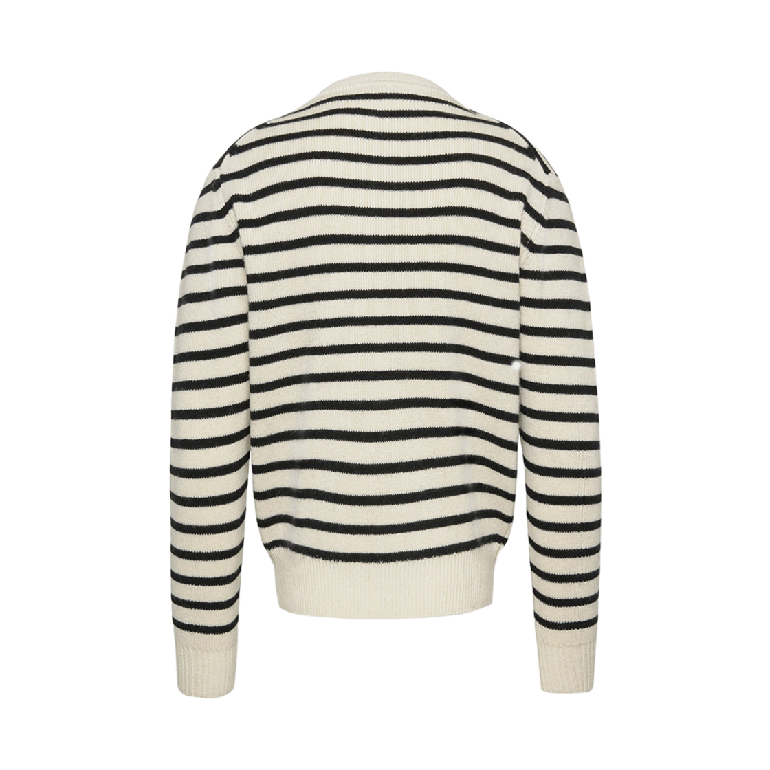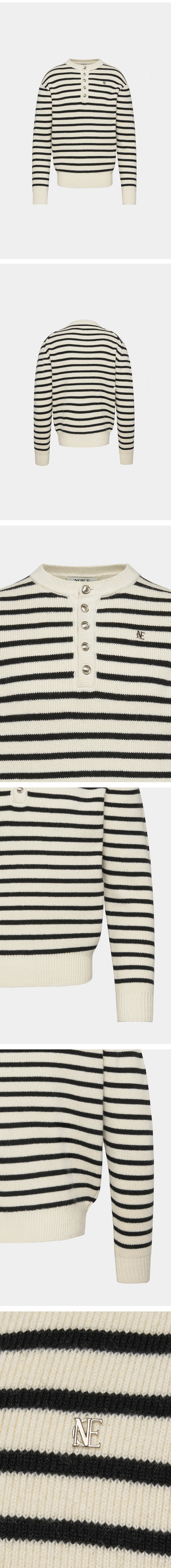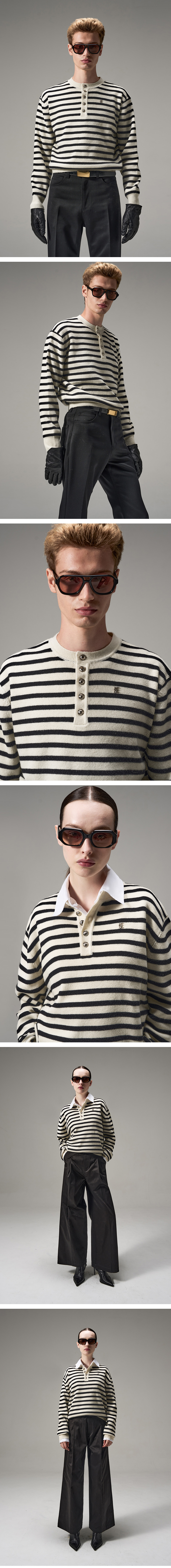 부드러운 메리노 울 소재로 제작된 헨리넥 스웨터입니다. 볼륨감 있는 실루엣이 특징이며, 입체감 있는 메탈 단추와 금속 심볼 디테일이 포인트입니다.