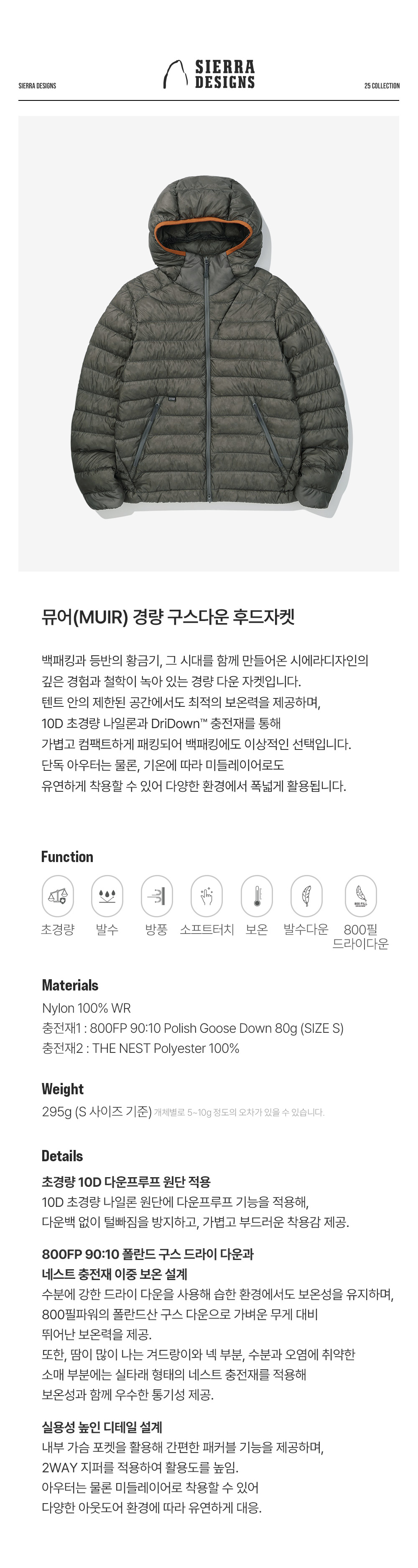 시에라디자인 우먼 뮤어 경량 구스다운 후드자켓 차콜