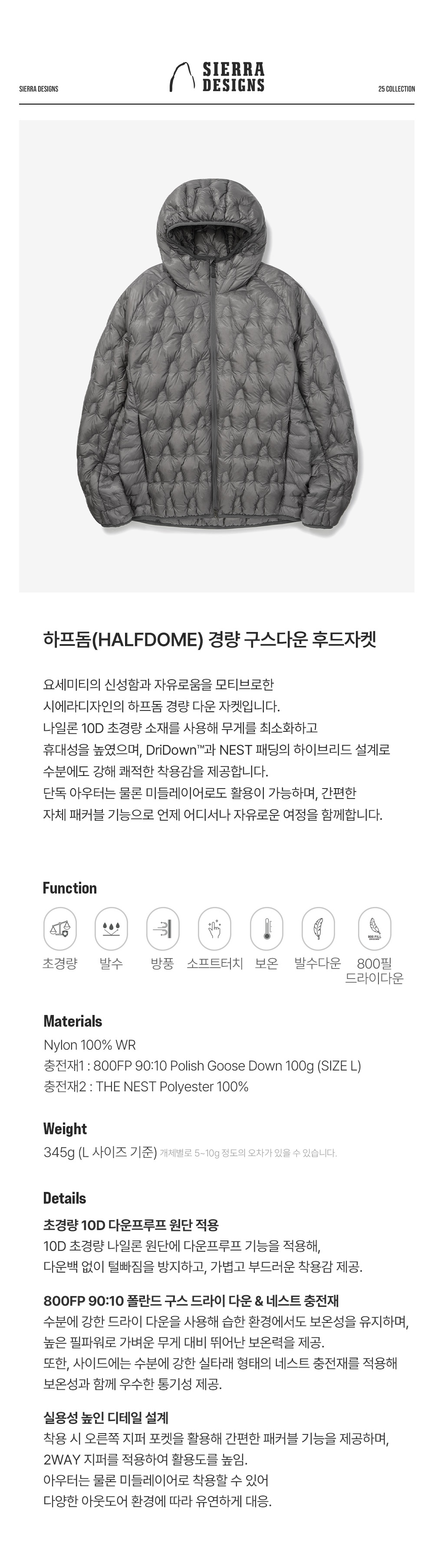 시에라디자인 하프돔 경량 구스다운 후드자켓 그레이