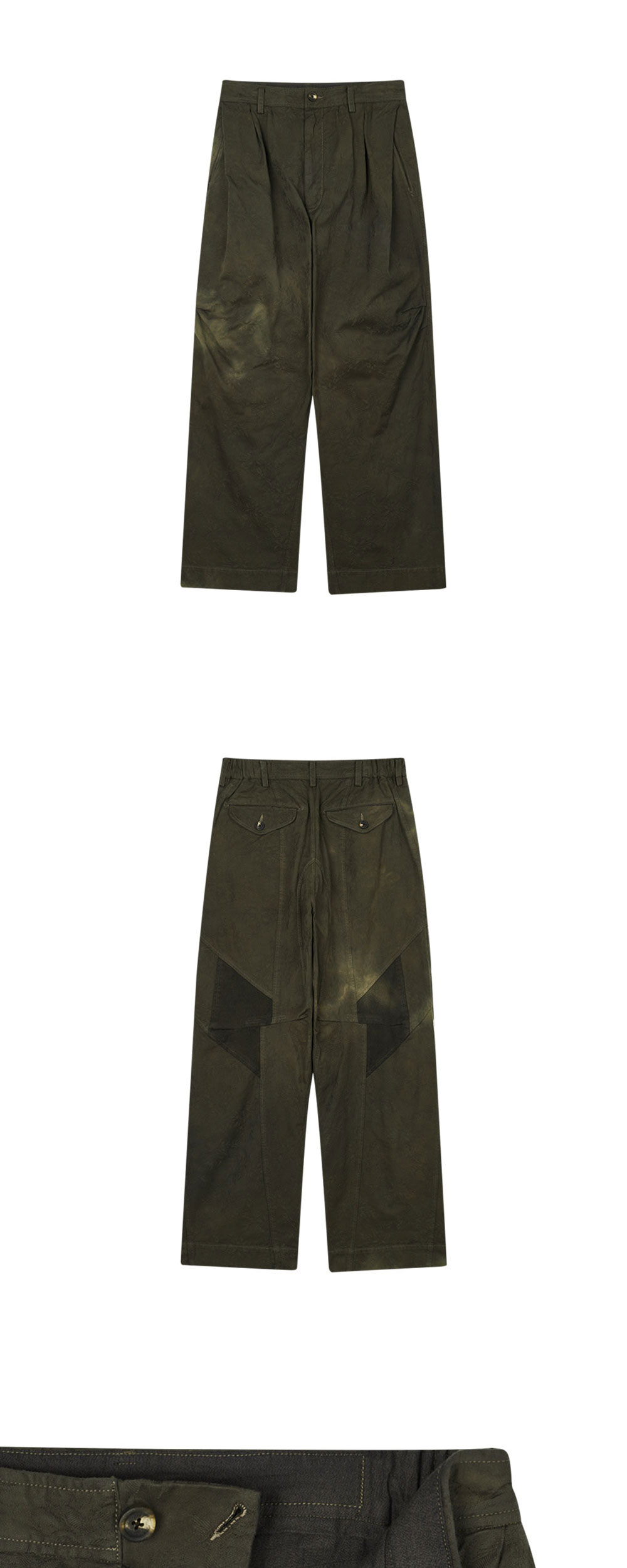 지기첸 자카드 헤비 패치워크 트라우저 멀티입니다. - 허리 부분의 셔링과 패치 워크 디테일 - 옆선의 다트로 입체감 강조 - 전체적인 실루엣을 돋보이게 하는 곡선 패턴 디자인 - 브랜드 특유의 패턴이 적용된 자카드 코튼 소재 - 질감 있는 표면과 두툼한 촉감 - 초가을부터 봄까지 착용 가능