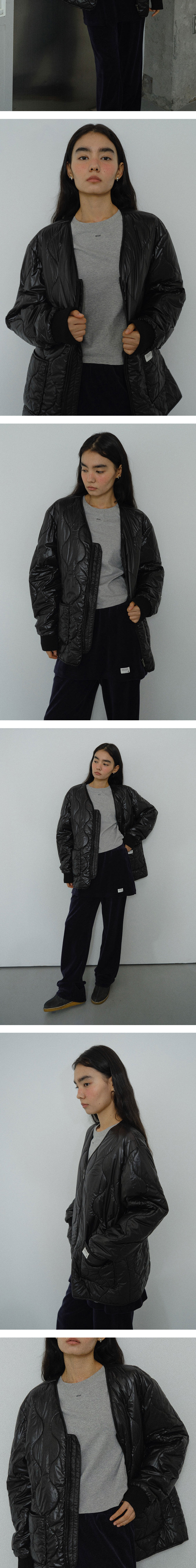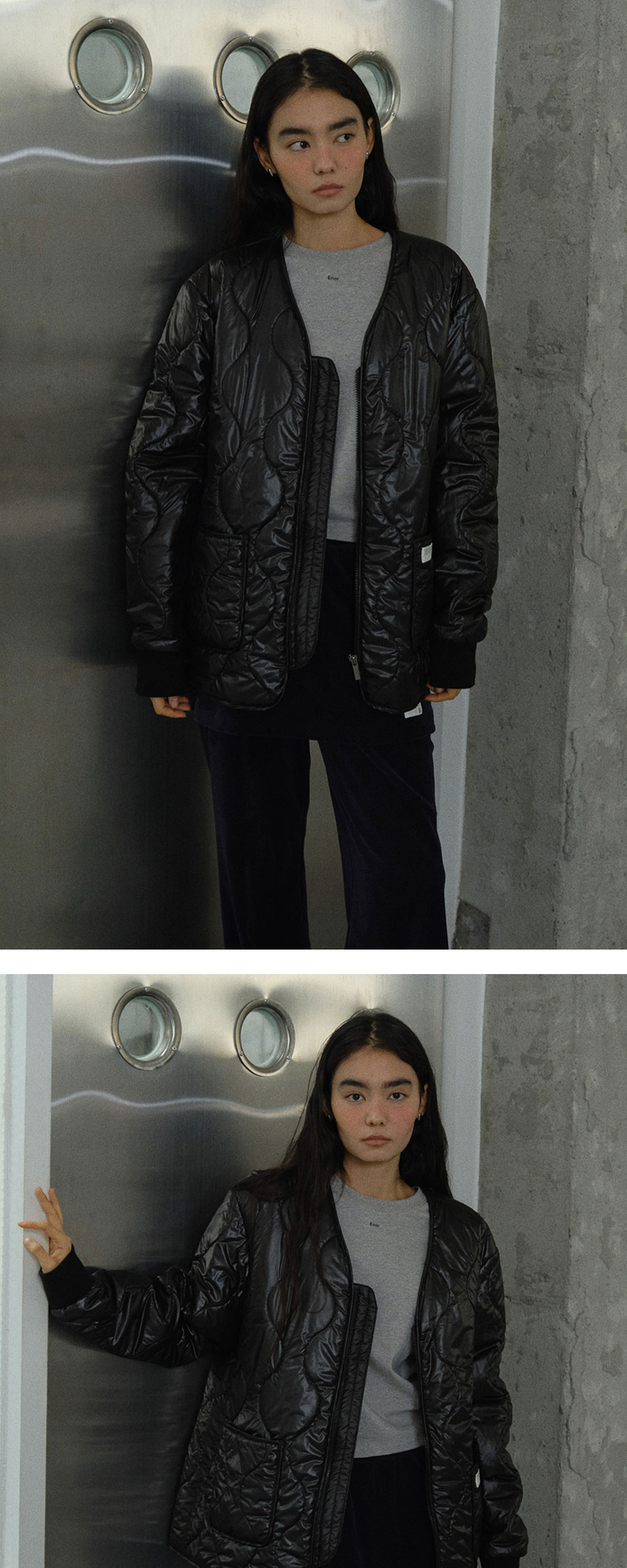 - ENOR의 코어라인으로 제작된 글로시한 소재감이 돋보이는 오버사이즈 퀼팅 재킷입니다. - 2온스 양면 누빔 원단을 사용해 간절기부터 초겨울까지 가볍게 걸치기 좋은 두께감으로 제작되었습니다. - 홑겹 구조로 가볍고 편안한 착용감을 제공하며, 소매는 시보리 마감으로 외부 찬 바람을 효과적으로 막아줍니다. - 앞면에는 큼직한 패치 포켓 2개를 배치해 실용성을 높였고, 전면 플라켓과 비슬론 지퍼 클로저로 퀄리티를 더했습니다. - 앞면에는 ENOR 포인트 라벨 디테일을 더해 고급스럽게 마무리했습니다.