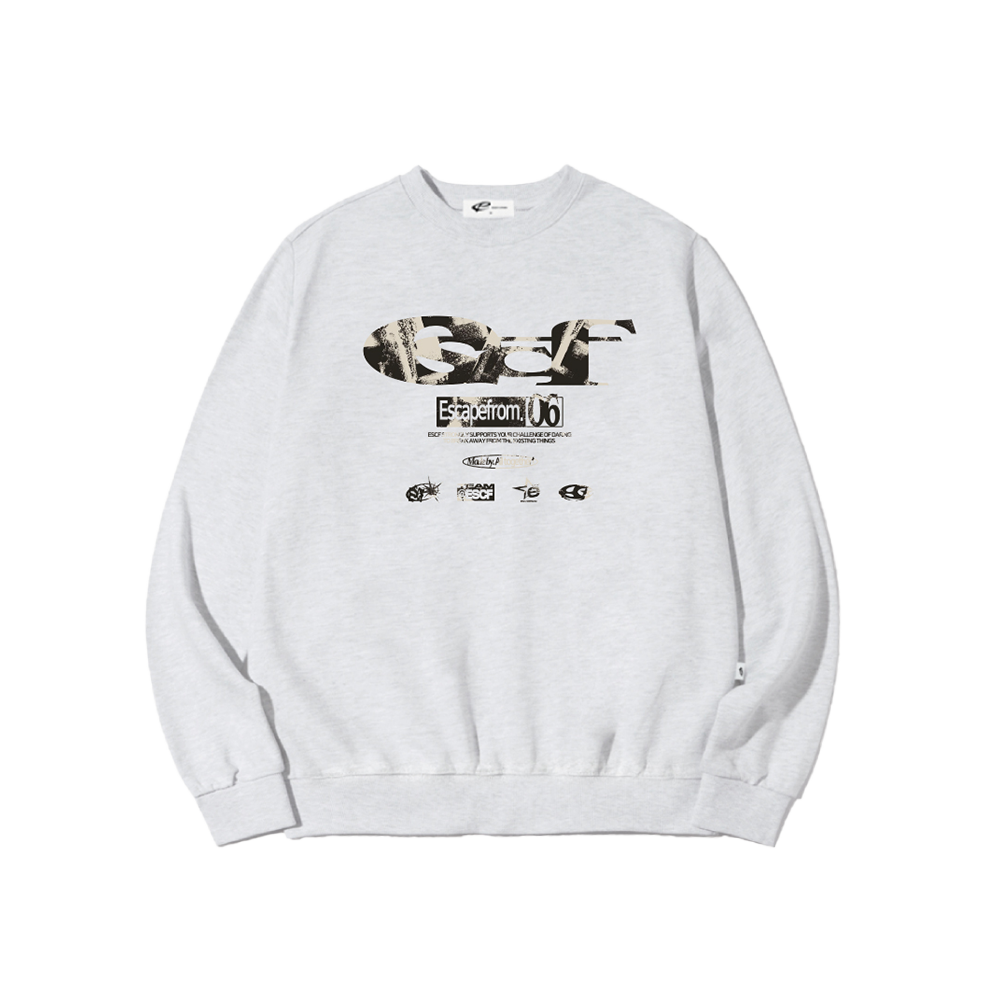 이스케이프프롬 스탬프 ESCF 로고 콜라주 프린트 맨투맨 화이트멜란지