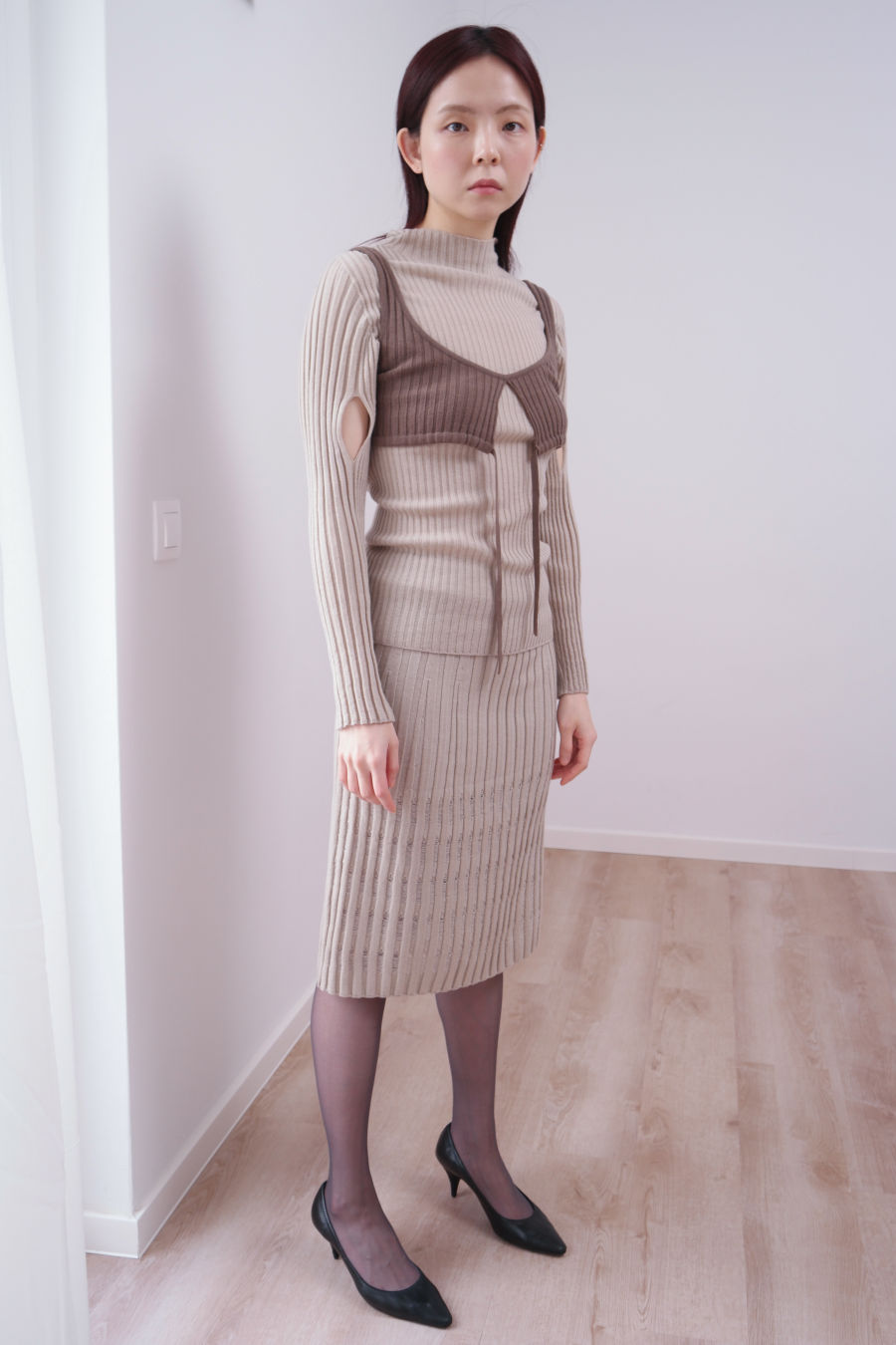 홀가먼트 니트탑으로 봉제선이 없어 가볍고 편안합니다, 소매의 슬릿이 포인트되는 기본 탑으로, 미세한 허리라인이 잡혀있습니다, 전체 립 조직으로 신축성이 매우 뛰어납니다, MOCK-NECK 라인으로, 목선을 보여주는 간절기 풀오버/ 겨울 이너웨어 입니다.