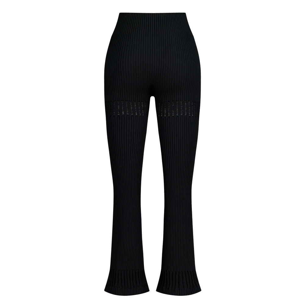 레이스 립 조직이 포인트인 부츠컷 니트 팬츠 입니다, 홀가먼트 니트로, 봉제선이 없이 매끄러운 부츠컷 라인을 보여줍니다, 전체 립 조직으로 신축성이 매우 좋습니다.