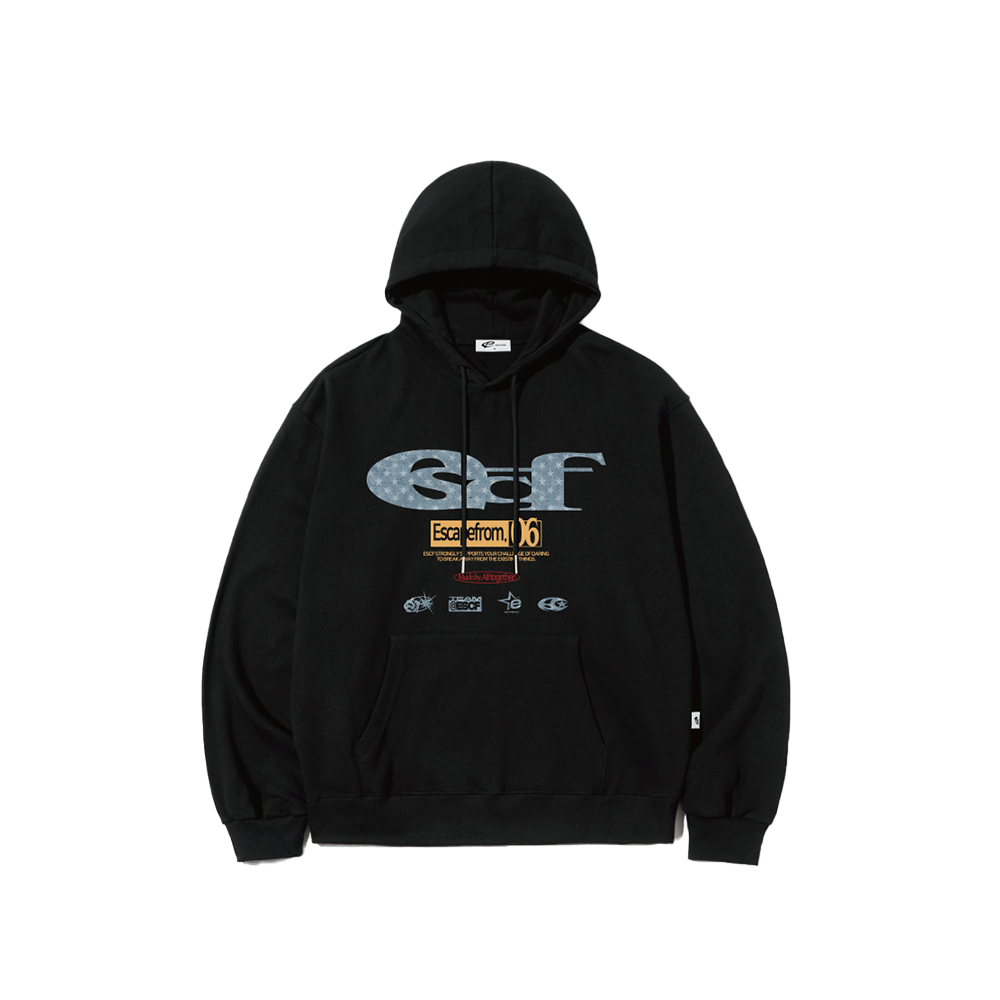 이스케이프프롬 블루 별 데님 ESCF 로고 콜라주 프린트 후드티 블랙
