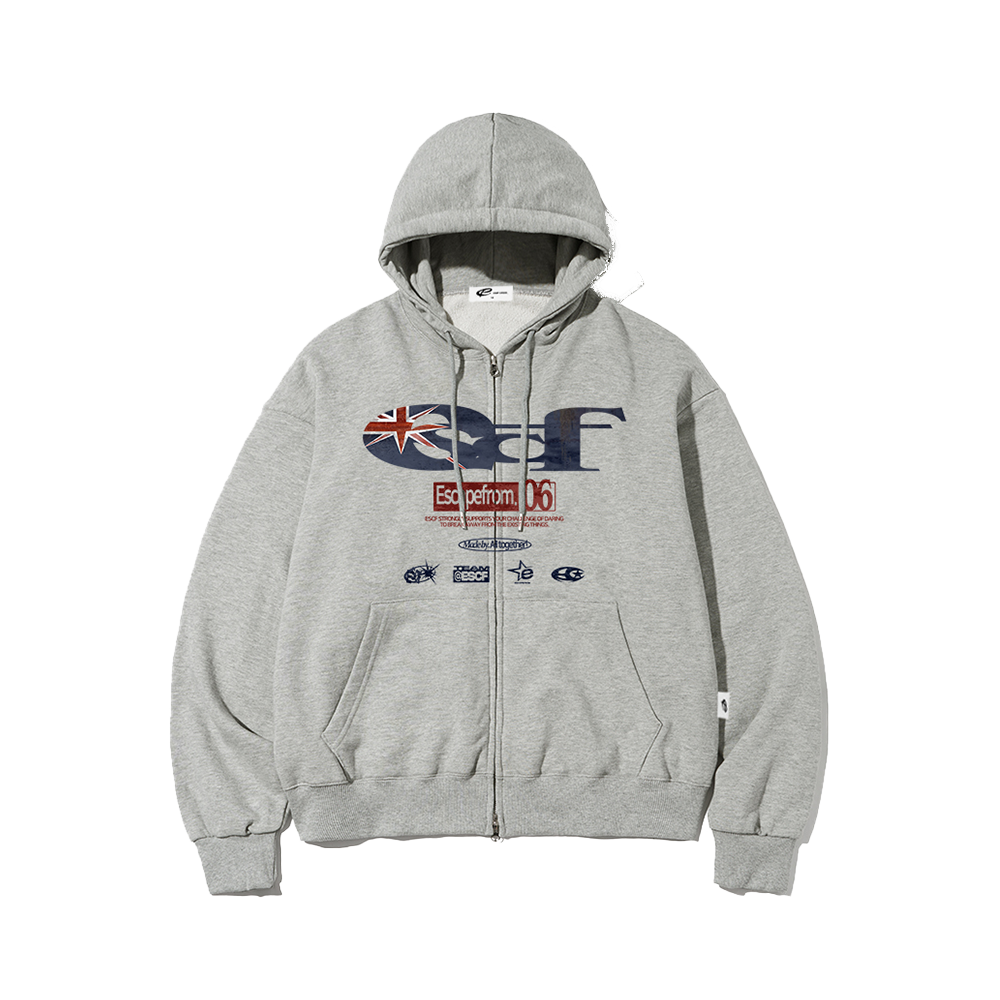 Escapefrom British Vintage ESCF Logo Collage Print Two-Way Hoodie Zip-Up Gray