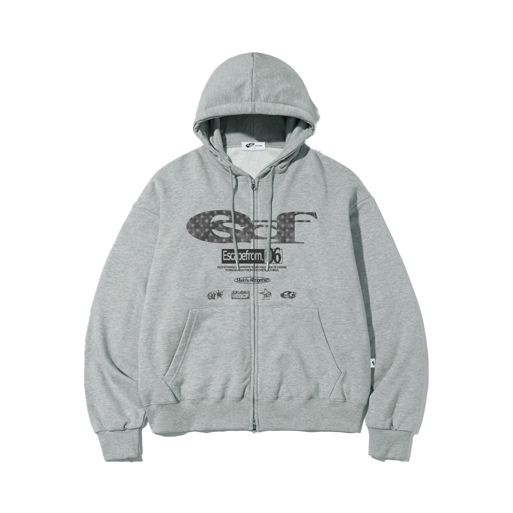 Escapefrom Black Star Denim ESCF Logo Collage Print Two-Way Hoodie Zip-Up Gray