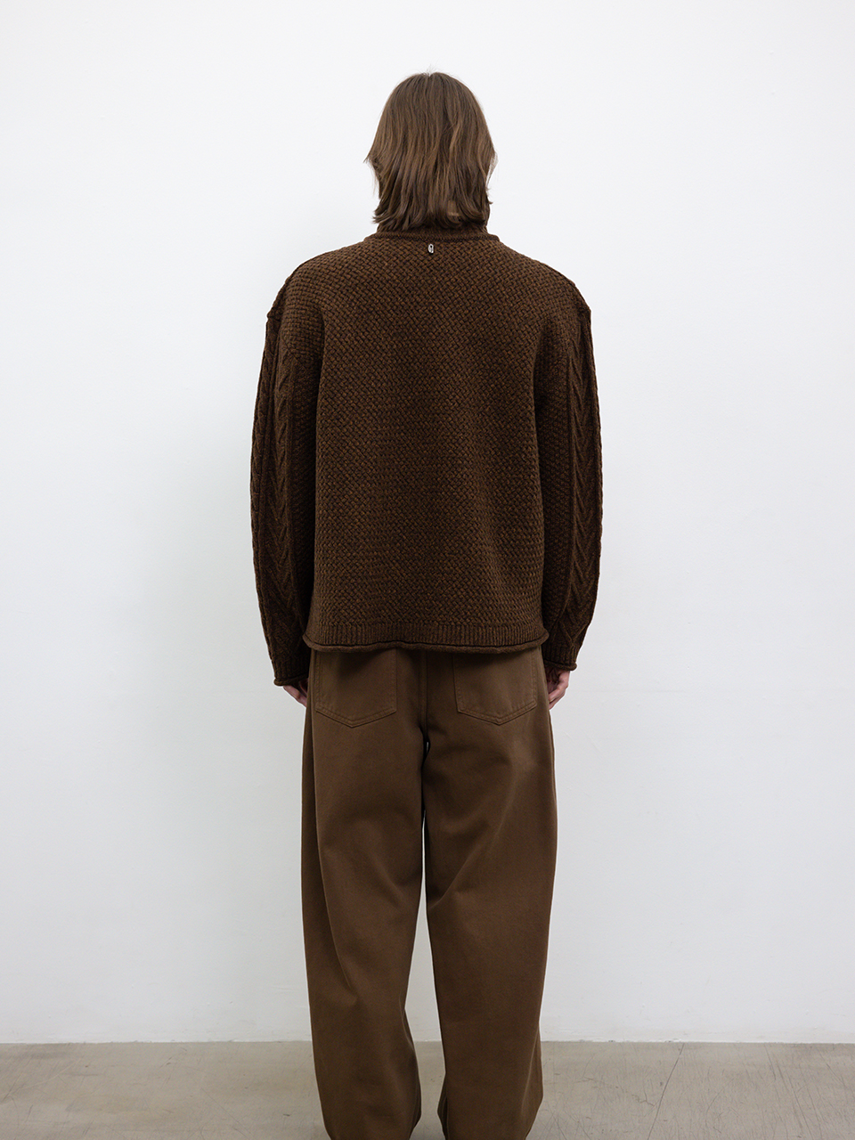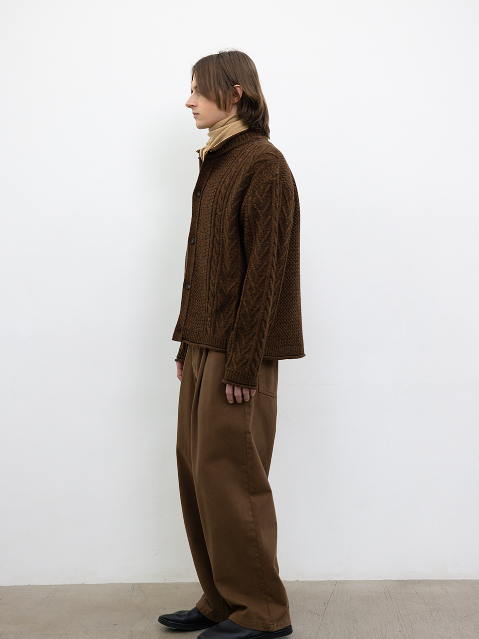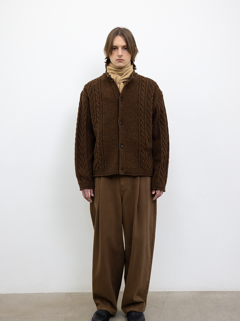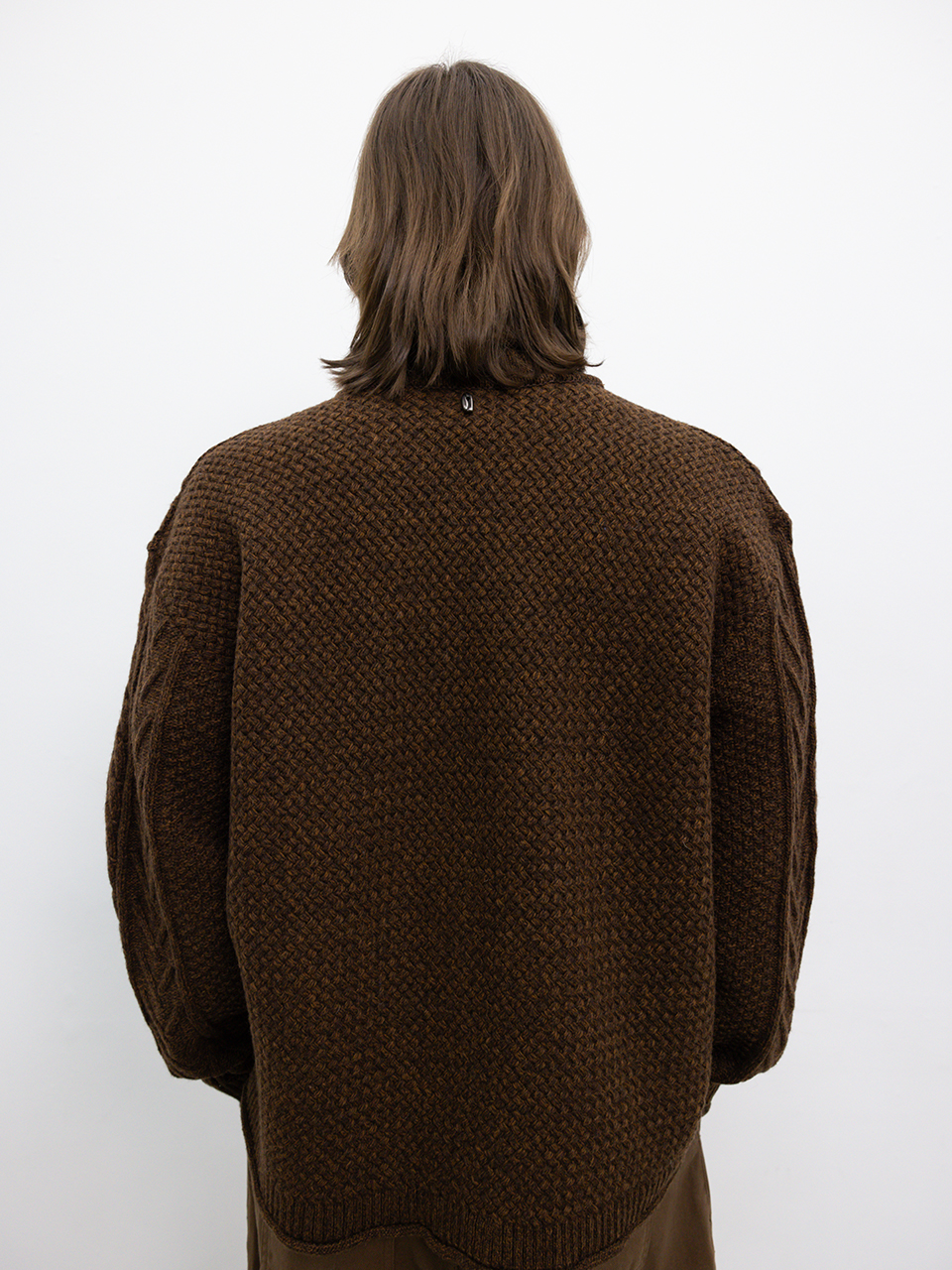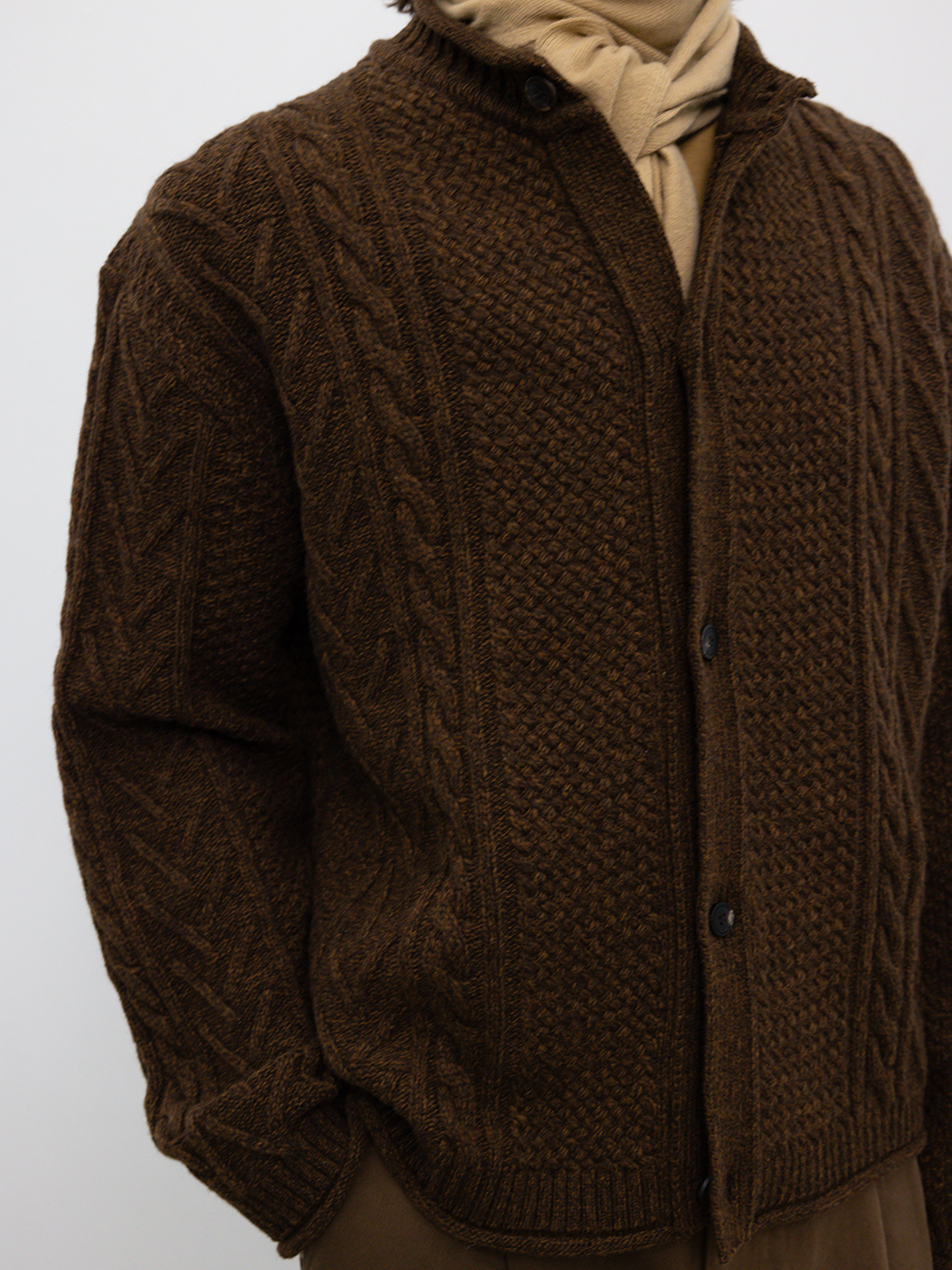 울 블랜드 소재로 제작되어 포근함과부드러운 터치감울 보여주는 니트웨어입니다. 서로 다른 케이블 패턴이 어우러져 입체적이고 고급스러운 텍스처를 연출합니다. 네크라인, 밑단, 그리고 칼라 끝단은 자연스럽게 말리는 마감 처리로 포인트를 더했으며, 클래식한 분위기의 소뿔 단추에는 브랜드 로고가 정교하게 각인되어 고급스러움을 보여줍니다. 46 어깨 53.5CM 가슴 61.5CM 총장 65.5CM 밑단 57CM 암홀 26CM 소매장 59CM 48 어깨 56CM 가슴 64CM 총장 67CM 밑단 59.5CM 암홀 26CM 소매장 59CM 50 어깨 58.5CM 가슴 66.5CM 총장 68.5CM 밑단 62CM 암홀 27CM 소매장 60CM 치수는 재는 위치에 따라 1-3cm 차이 생길 수 있습니다. 어두운 원단은 염색되었기 때문에 밝은 아이템과 착용 시 주의 부탁드립니다. DRY CLEAN ONLY 181cm 마른체형 모델 48 SIZE 착용