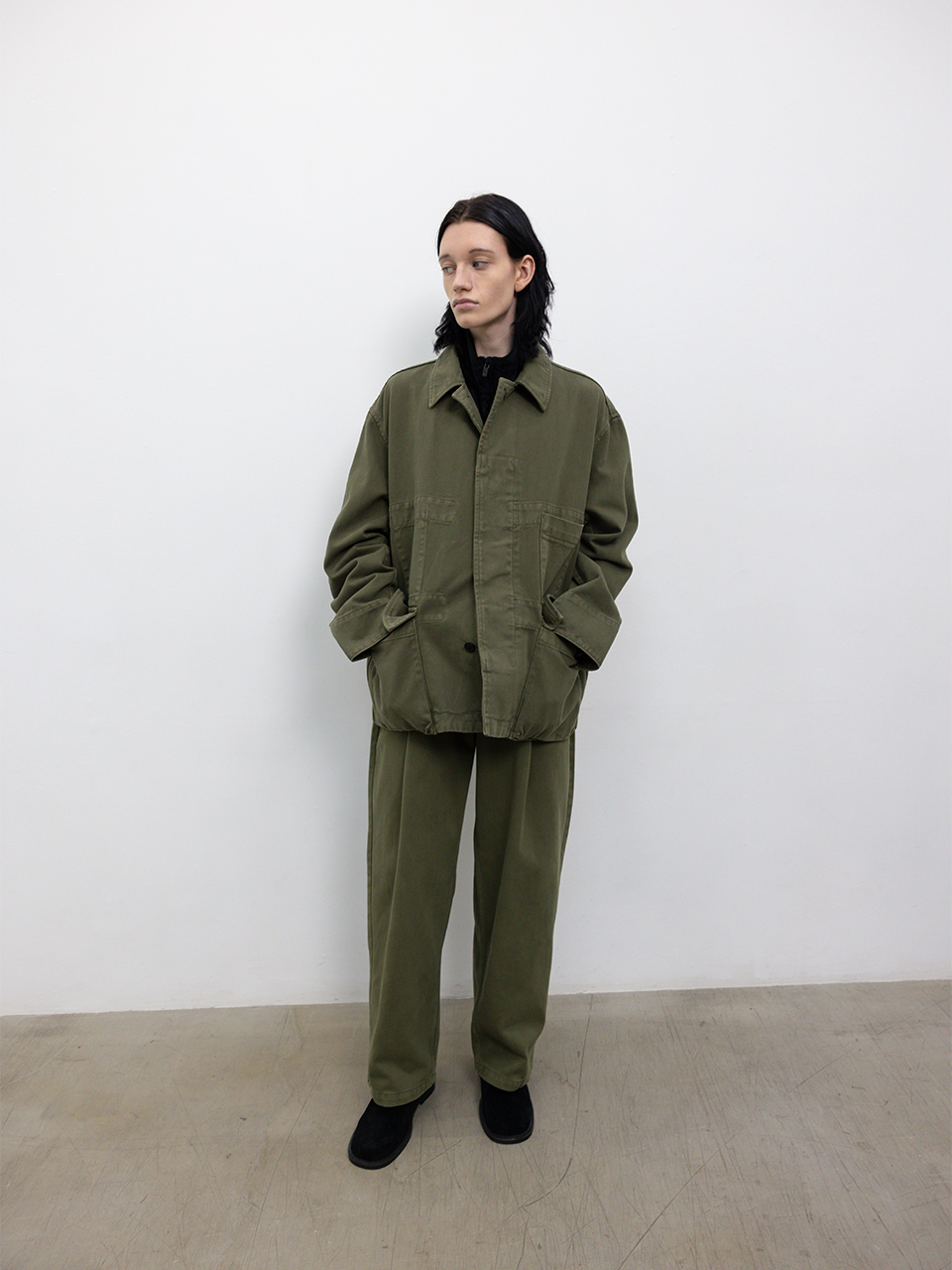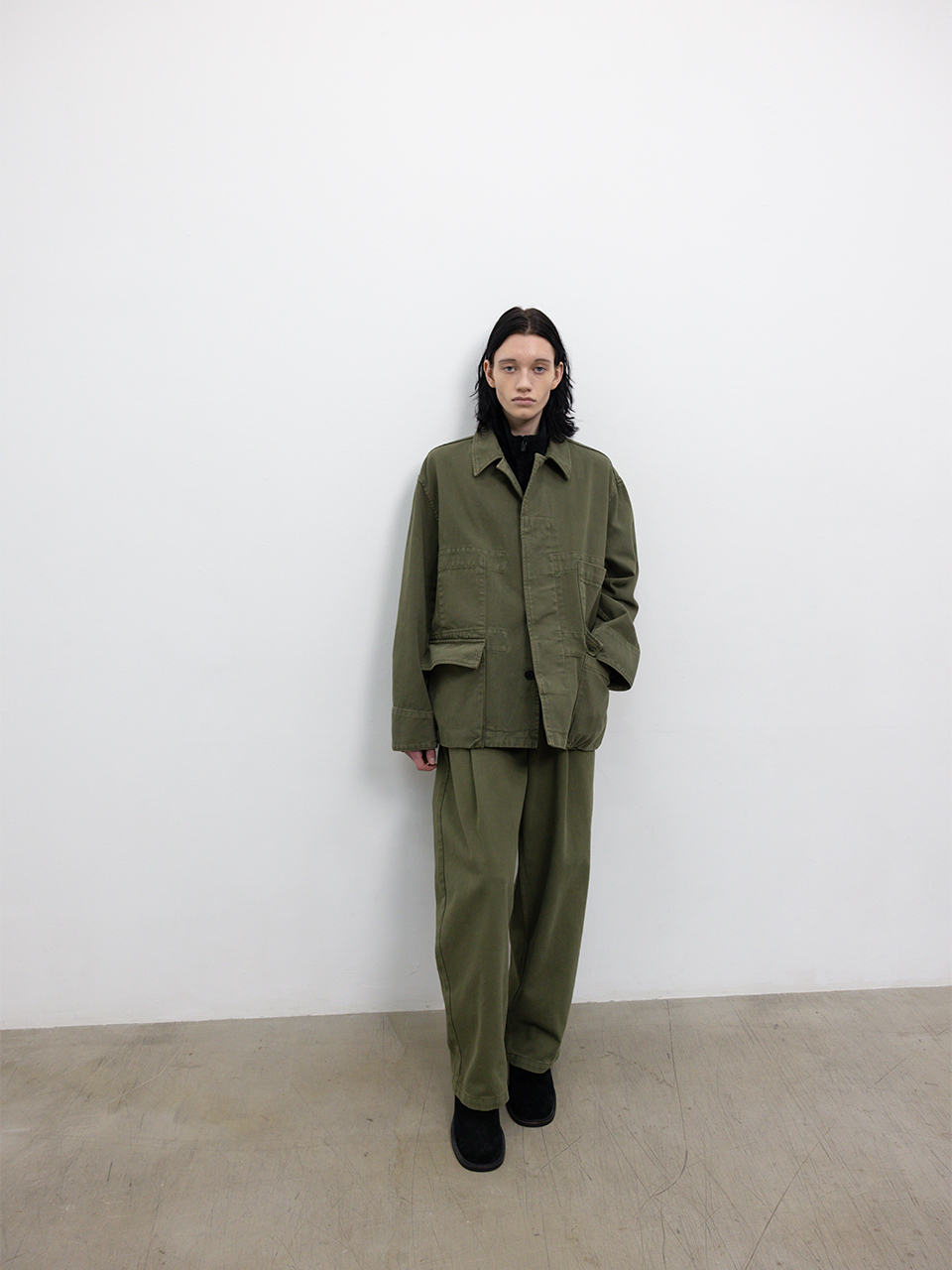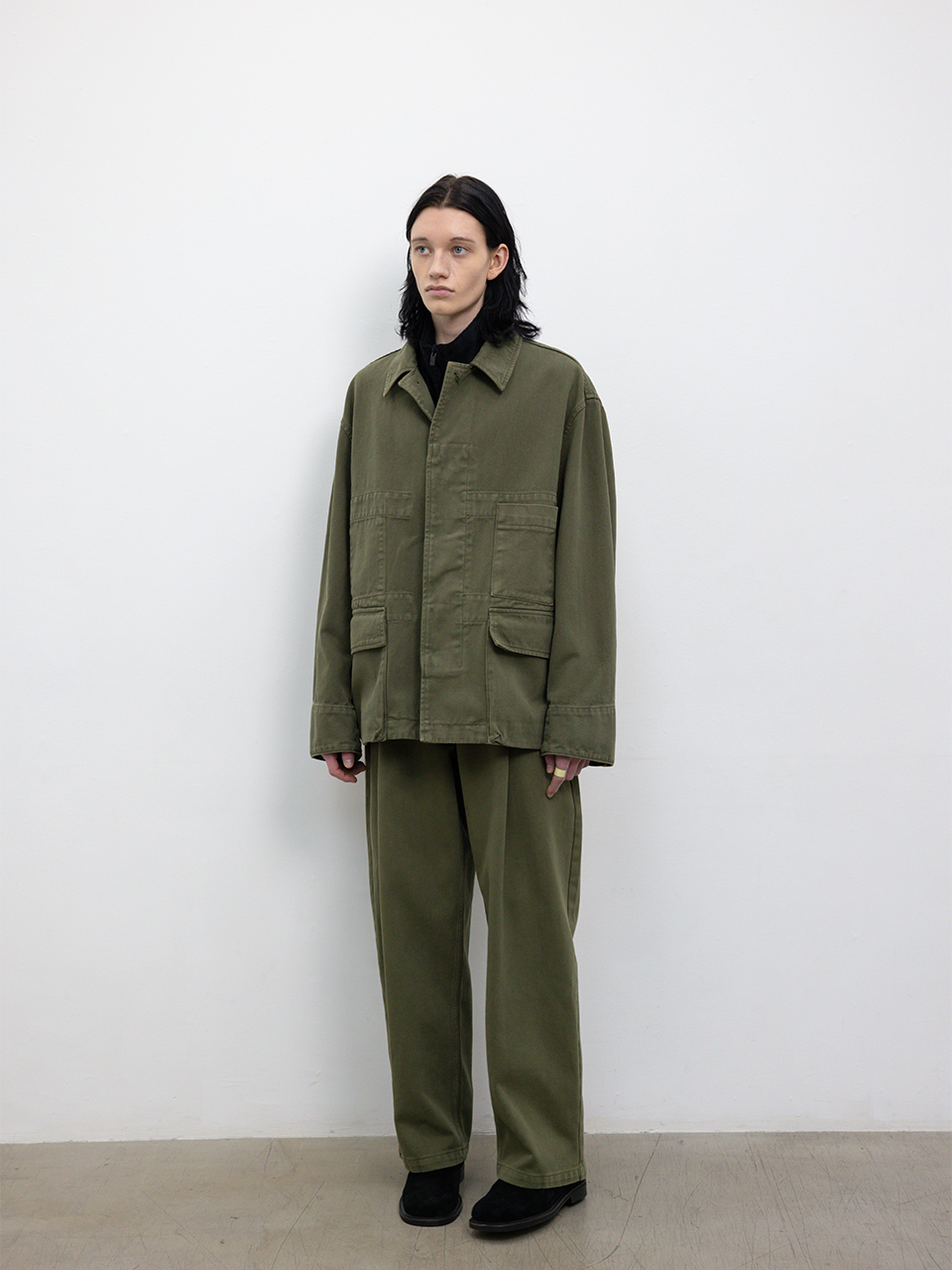 견고한 조직과 부드러운 터치감을 지닌 코튼 데님 자켓입니다. 클래식한 필드 자켓 디자인을 현대적으로 재해석한 세미 오버사이즈 실루엣, 프론트 구조적인 아웃포켓으로 포인트며 미어짐 방지를 위해 안쪽 원단을 덧대어 견고함을 더했습니다. 로고 각인된 소뿔 단추와 개발한 심볼 금속 장식으로 마무리하였습니다. 오버 다잉 가먼트 워싱 공정 특성 상 부자재 이염이 있을 수 있으며 이는 불량 상품이 아닌 점을 안내드립니다 46 어깨 56CM 가슴 63CM 총장 71.5CM 밑단 64.5CM 소매 60.5CM 소매부리 15CM 48 어깨 58CM 가슴 65CM 총장 72.5CM 밑단 67CM 소매 61.5CM 소매부리 16CM 50 어깨 60CM 가슴 67CM 총장 73.5CM 밑단 69.5CM 소매 62.5CM 소매부리 17CM 치수는 재는 위치에 따라 1-3cm 차이 생길 수 있습니다. 밝은 아이템과 착용 시 주의 부탁드립니다. DRY CLEAN ONLY 181cm 마른체형 모델 48 SIZE 착용
