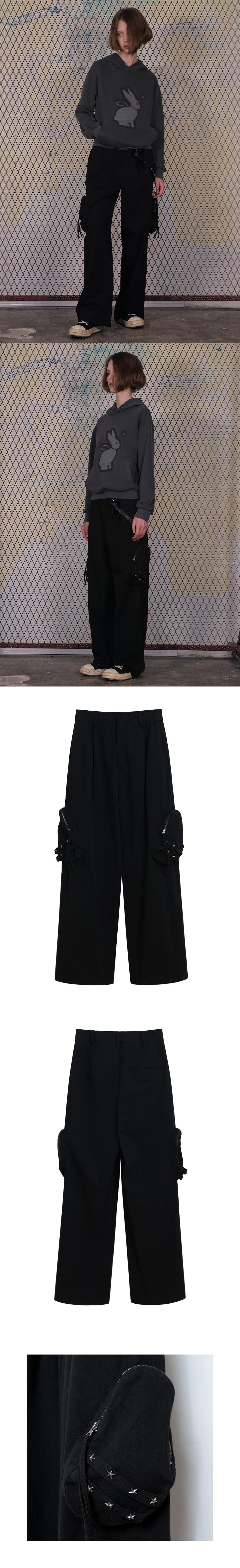 - 사이드 포켓에 리벳 스트랩 디테일 - 지퍼 슬라이더에 끈 디테일 cotton: 100 Size(cm)단면 Length/ Waist/ Hip/ Hem 1: 100/ 33.5/ 51/ 27 2: 100/ 35.5/ 53/ 27 model: 176cm 1 size