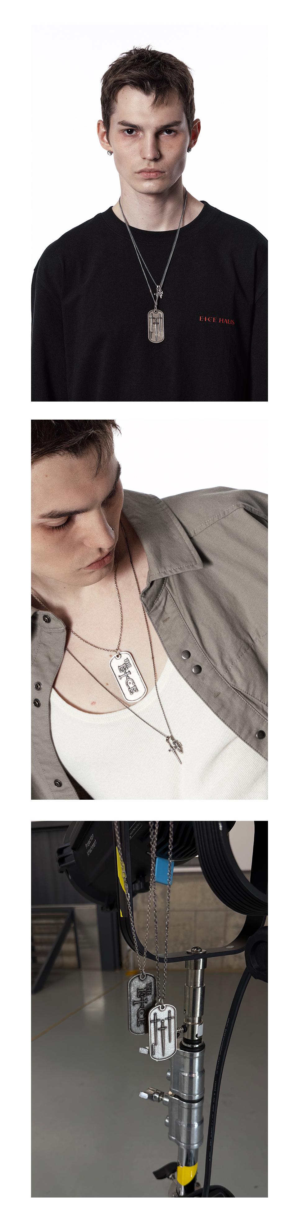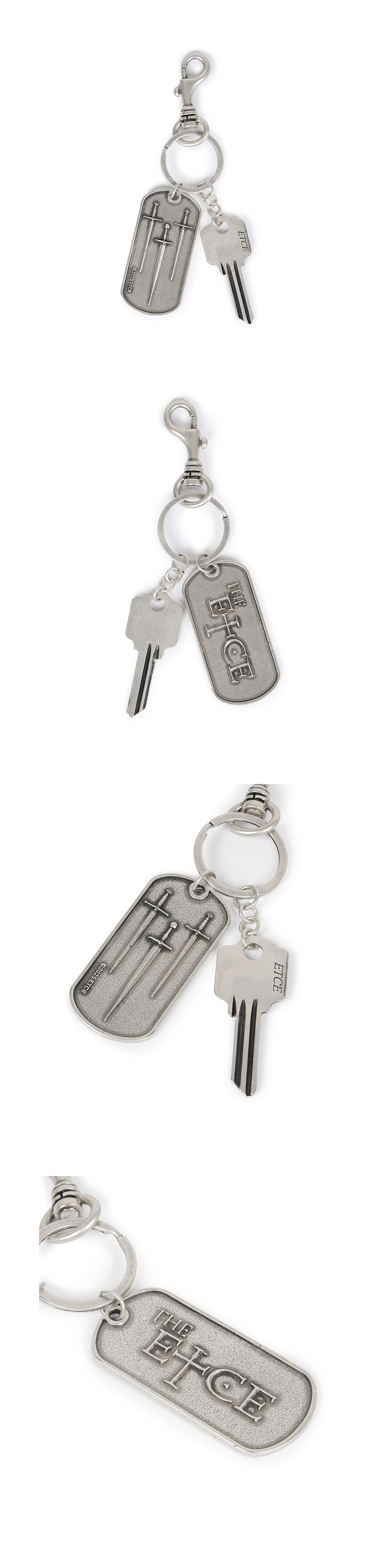 - 가상의 소설에서 파생된 모티브 - 아트웍 도그태그, 로고 키 펜던트 콤비 - 실버 버니쉬 MADE IN KOREA *금속 특성상 충격, 마찰, 습기에 의해 스크래치·변색이 발생할 수 있습니다. *물, 땀, 화장품 등에 장시간 노출 시 변색이 가속될 수 있으니 사용 후 마른 천으로 가볍게 닦아 보관해 주세요. *어린이·반려동물이 닿지 않는 곳에서 보관해 주세요.