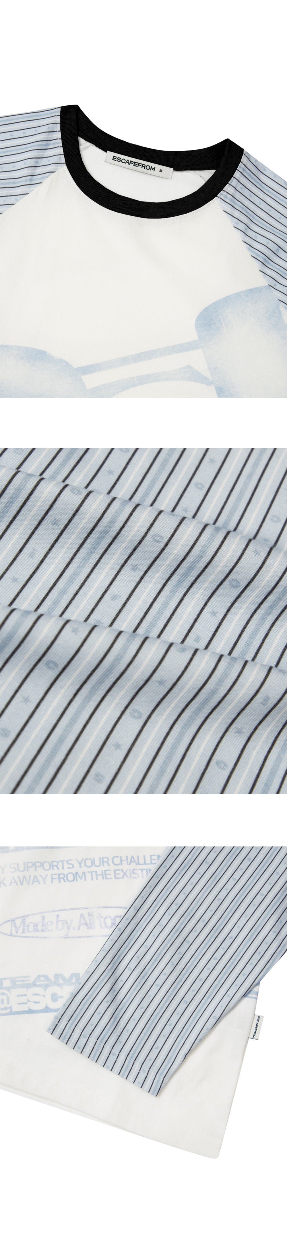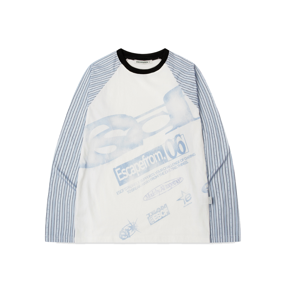 이스케이프프롬 스트라이프 틸티드 ESCF 로고 콜라주 롱슬리브 스카이블루