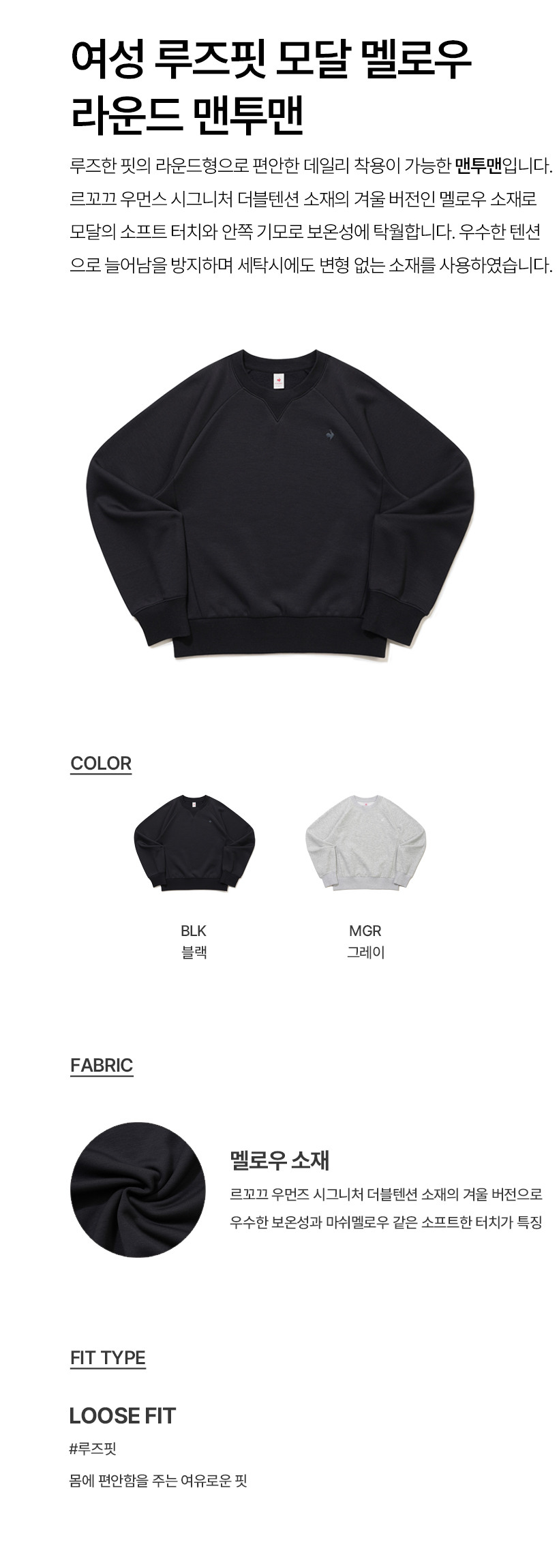 르꼬끄 스포르티브 여성 루즈핏 모달 멜로우 라운드 맨투맨 - 그레이(QQ422OFSO1)