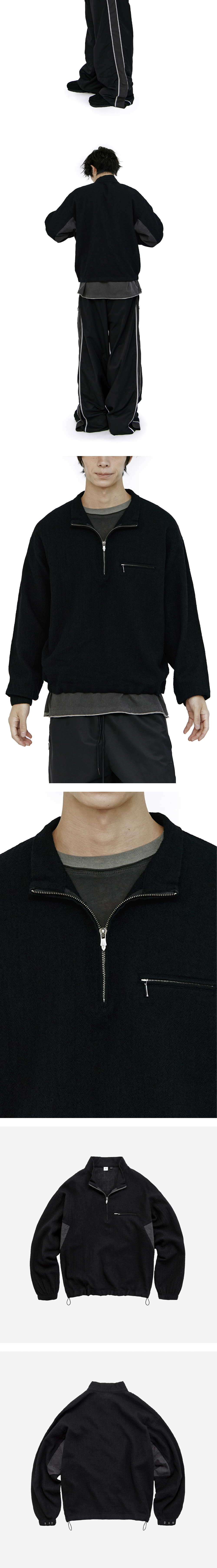 boiled wool half zip (paisley patched) - black - 축용 가공한 울 패브릭 특유의 실루엣이 특징적인 하프 집 - 매우 가벼우며, 흐르는 듯한 착용감 - 사이드 & 뒷소매 페이즐리 배색감 - 지퍼를 풀고 연출할 시, 축융 울 특유의 곡선감 표현 가능 - 1개의 프론트 포켓 - 폴리테루 별주 풀러 적용된 YKK 지퍼 - 밑단 스트링으로 레이어링에 용이 - 소매 버튼으로 실루엣 조절 가능 *모델: 175cm / 마른 체형, 3사이즈 착용