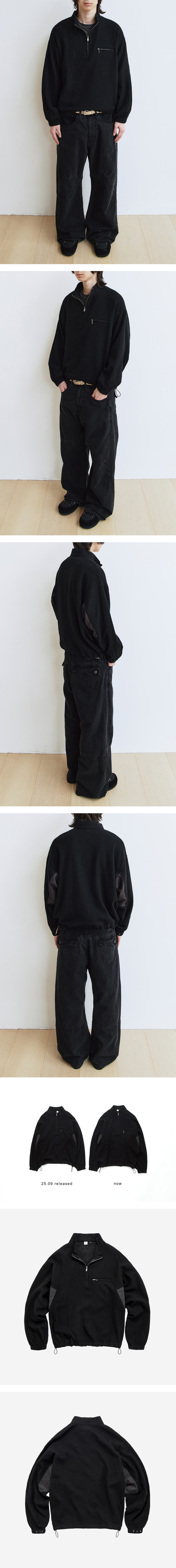 boiled wool half zip (paisley patched) - black - 축용 가공한 울 패브릭 특유의 실루엣이 특징적인 하프 집 - 매우 가벼우며, 흐르는 듯한 착용감 - 사이드 & 뒷소매 페이즐리 배색감 - 지퍼를 풀고 연출할 시, 축융 울 특유의 곡선감 표현 가능 - 1개의 프론트 포켓 - 폴리테루 별주 풀러 적용된 YKK 지퍼 - 밑단 스트링으로 레이어링에 용이 - 소매 버튼으로 실루엣 조절 가능 *모델: 178cm / 마른 체형, 3사이즈 착용 * 금번 차수는 직전 차수 대비, 치수감이 여유롭게 완성되었습니다. 정확한 상세 사이즈의 경우, 실측표 확인 부탁드립니다. * 직전 차수 대비, 금번 차수의 경우 유사한 컬러감으로 제작되었습니다. 자세한 사항은 상세 이미지 참고 부탁드립니다.