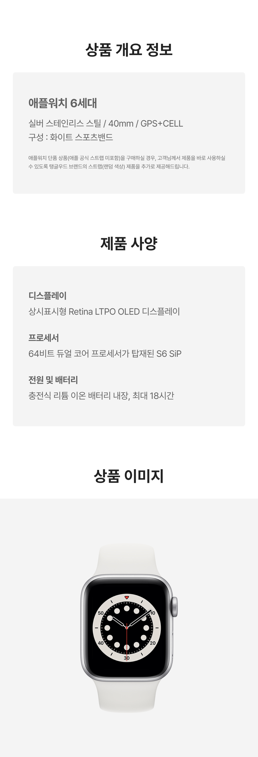 [B등급] 리퍼비시 애플워치 6 40mm GPS+cellular 실버 스테인리스 스틸 케이스 스포츠 밴드 화이트