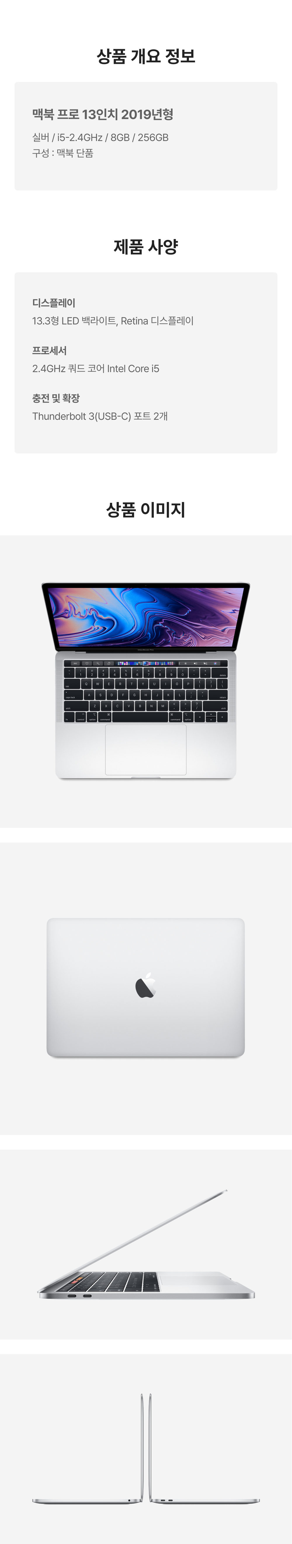 [B등급] 리퍼비시 2019 맥북 프로 13 i5-2.4GHz 256기가 SSD 8기가 램 실버