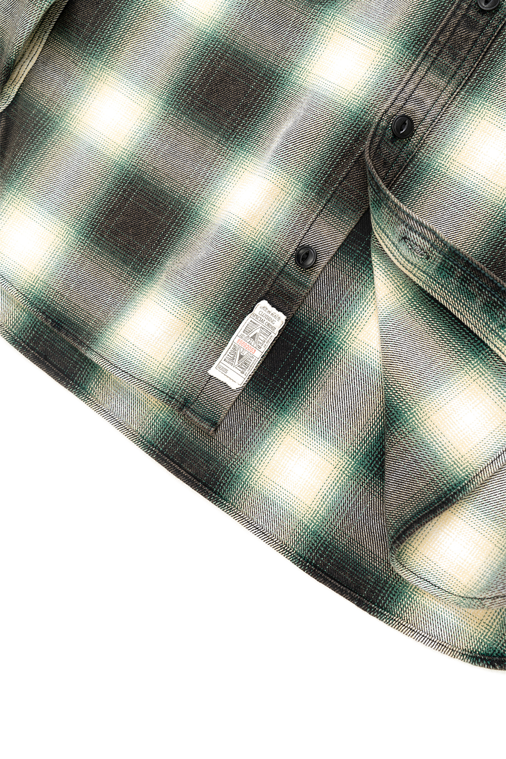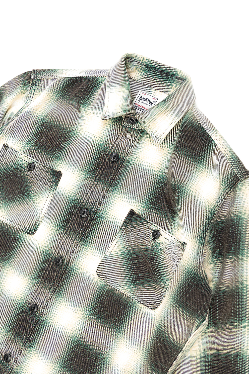 Houston Japan 41252VW Vintage Ombre Check Viyella Shirt - Green 가을/겨울 시즌을 위한 클래식한 휴스턴 재팬 비옐라 셔츠입니다. 옴브레 체크의 빈티지 가공 버전이며, 경년 변화를 즐길 수 있는 상품입니다. 굵은 실을 짜내어 묵직한 비옐라 원단으로 제작한 것이 특징입니다. 트리플 니들 스티칭, 루프 밑단, 유니언 티켓 등 빈티지풍 디테일이 특징입니다. * Cotton 100% * 빛에 의한 제품의 색감 차이가 존재 할 수 있습니다. * Made in China