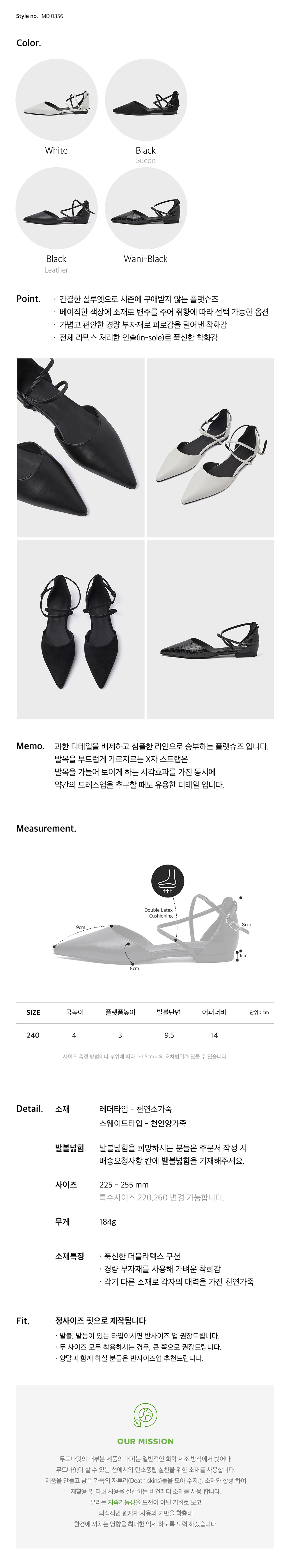 · 간결한 실루엣으로 시즌에 구애받지 않는 플랫슈즈 · 베이직한 색상에 소재로 변주를 주어 취향에 따라 선택 가능한 옵션 · 가볍고 편안한 경량 부자재로 피로감을 덜어낸 착화감 · 전체 라텍스 처리한 인솔(in-sole)로 푹신한 착화감