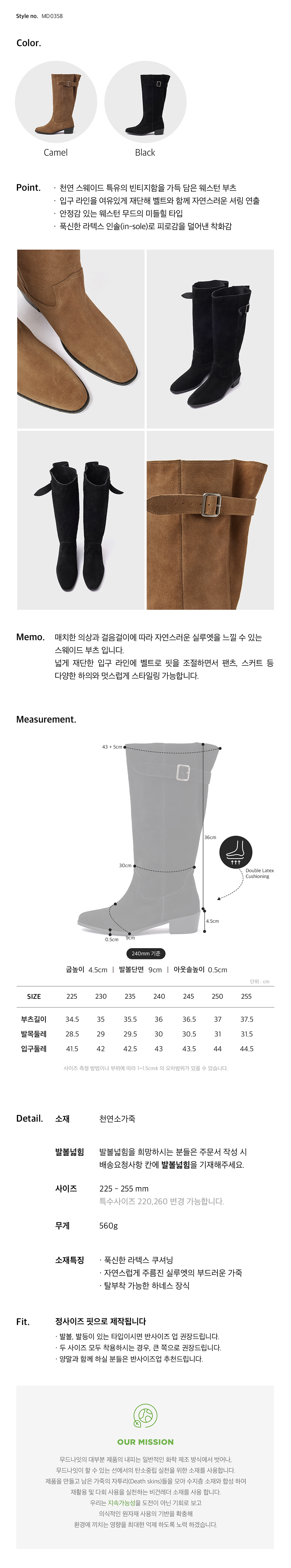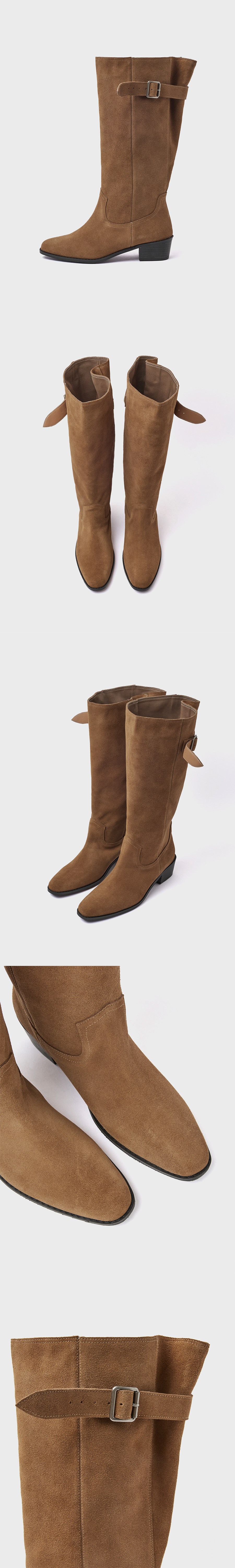 · 천연 스웨이드 특유의 빈티지함을 가득 담은 웨스턴 부츠 · 입구 라인을 여유있게 재단해 벨트와 함께 자연스러운 셔링 연출 · 안정감 있는 웨스턴 무드의 미들힐 타입 · 푹신한 라텍스 인솔(in-sole)로 피로감을 덜어낸 착화감