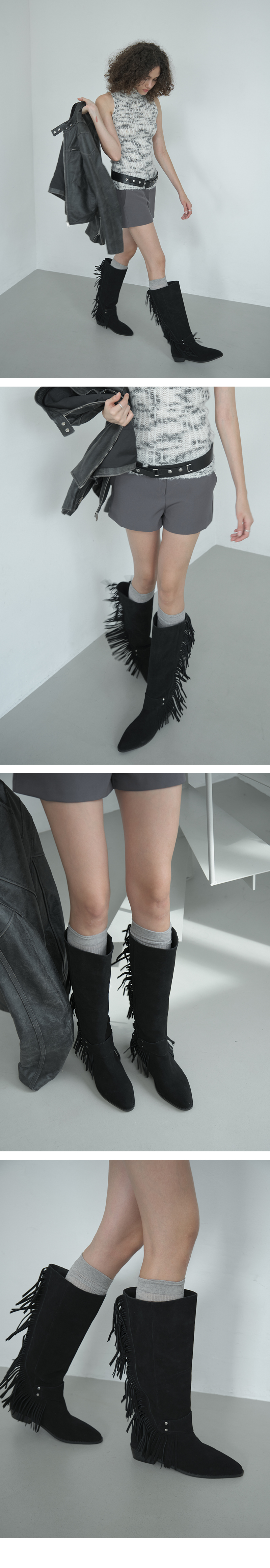 · 걸음걸이에 따라 살랑이는 프린지 장식이 멋스러운 롱부츠 · 뒷축을 따라 J라인으로 프린지를 배치하여 과하지 않은 포인트 · 웨스턴 무드를 담은 쉐입과 안정감 있는 굽 · 더블라텍스 인솔(in-sole)로 피로감을 덜어낸 착화감